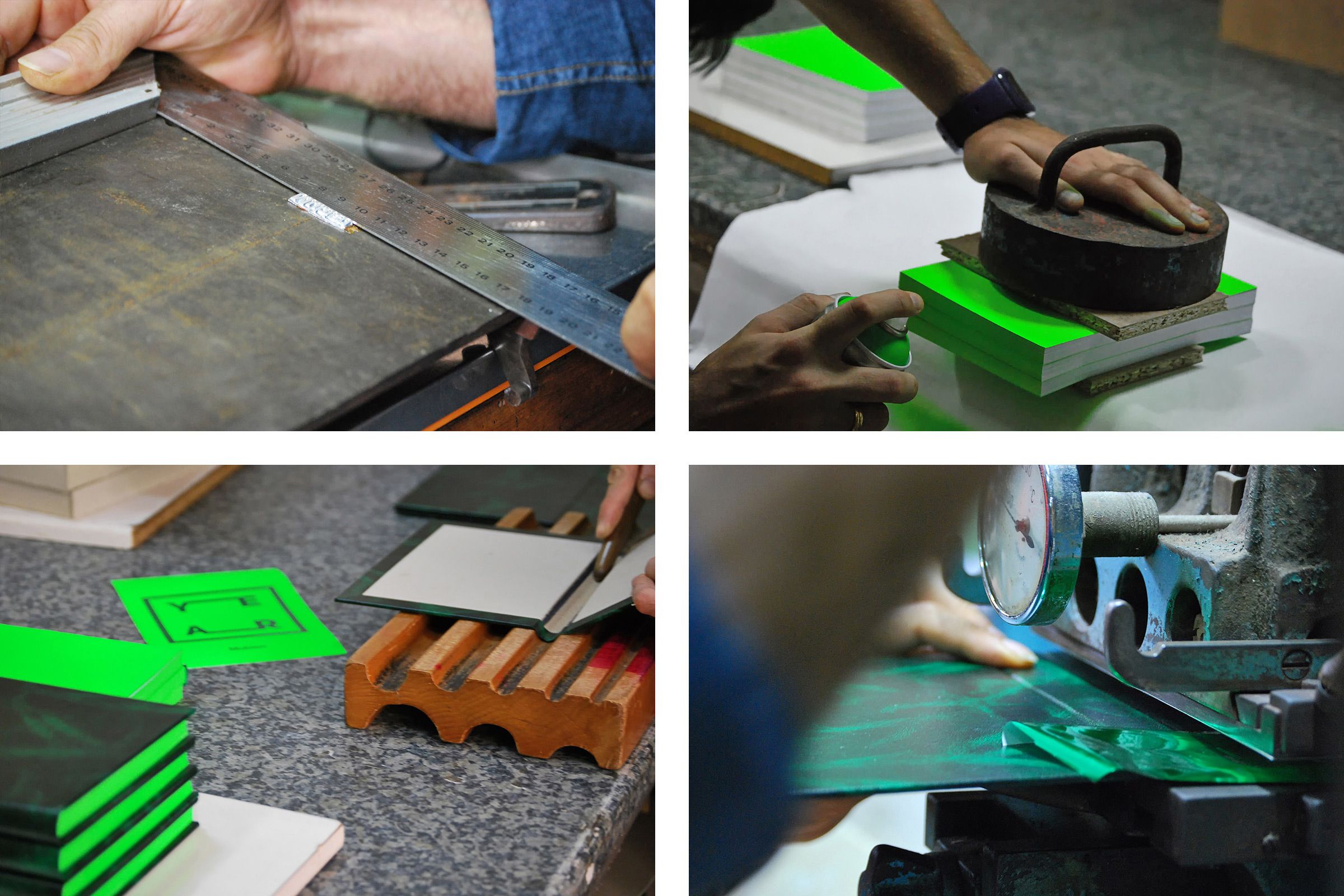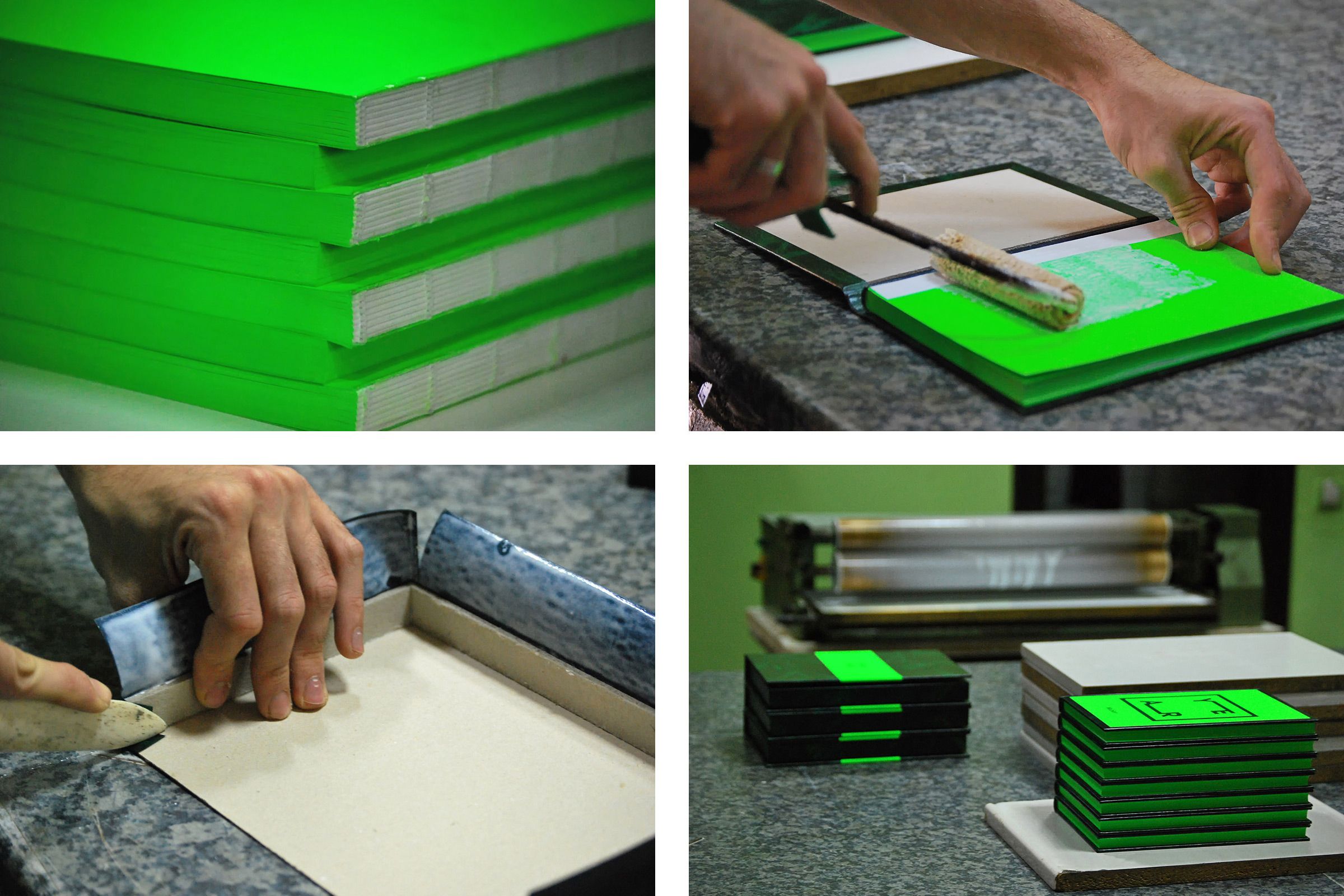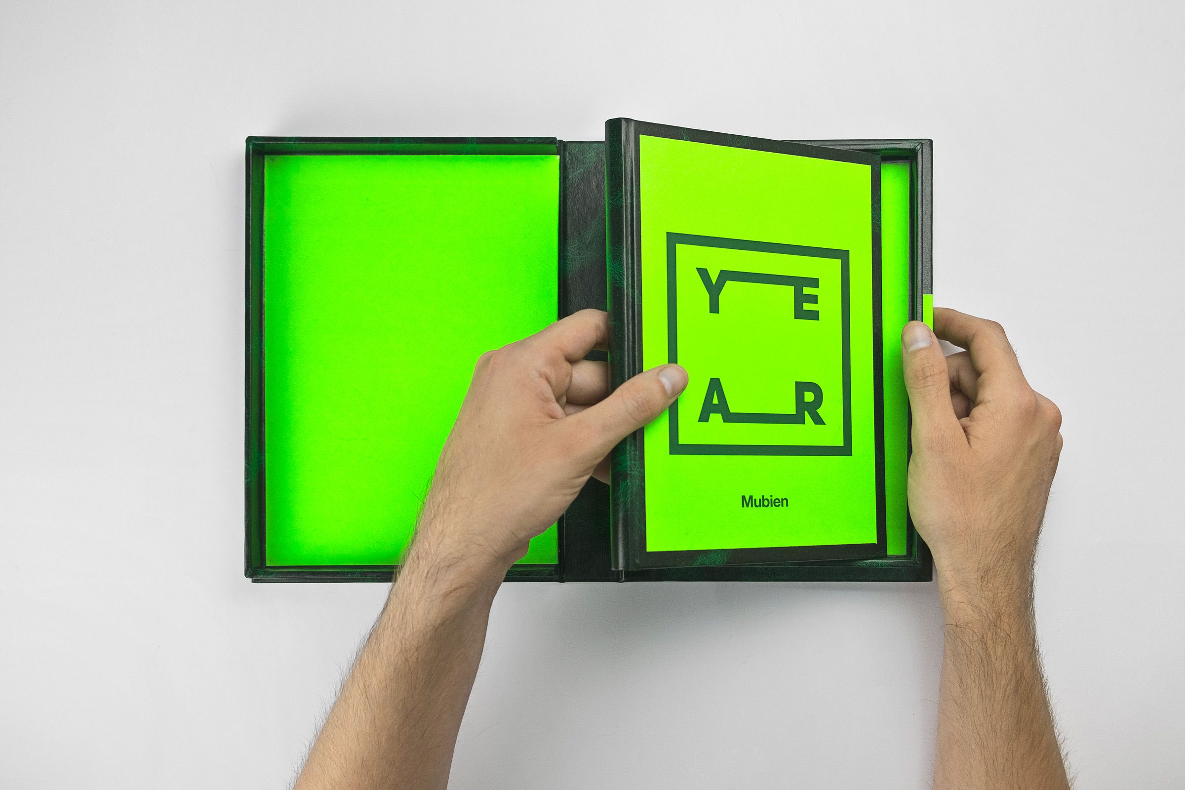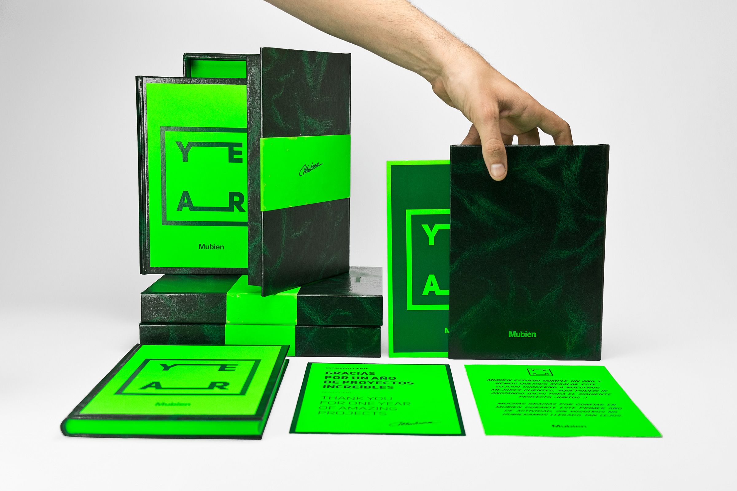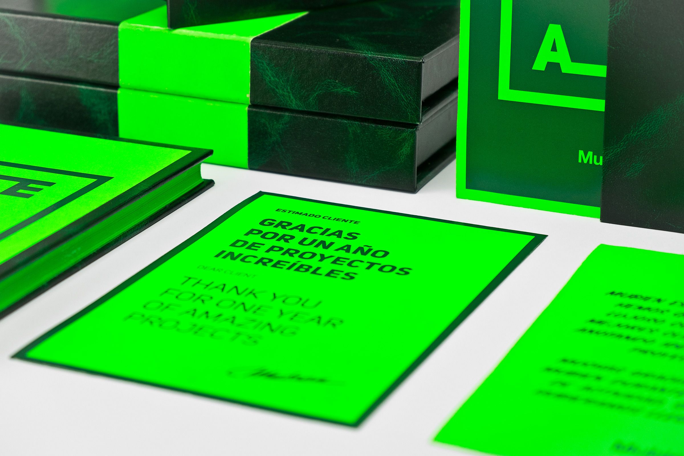 Todo el trabajo fue realizado a mano en nuestro estudio. Utilizamos una combinación de verde neón y “Verde Valencia” con el fin de reflejar la esperanza que tenemos en el proyecto, consiguiendo como resultado una lujosa caja que protege el cuaderno junto a una serie de fichas impresas sobre papel verde neón con mensajes de agradecimiento.