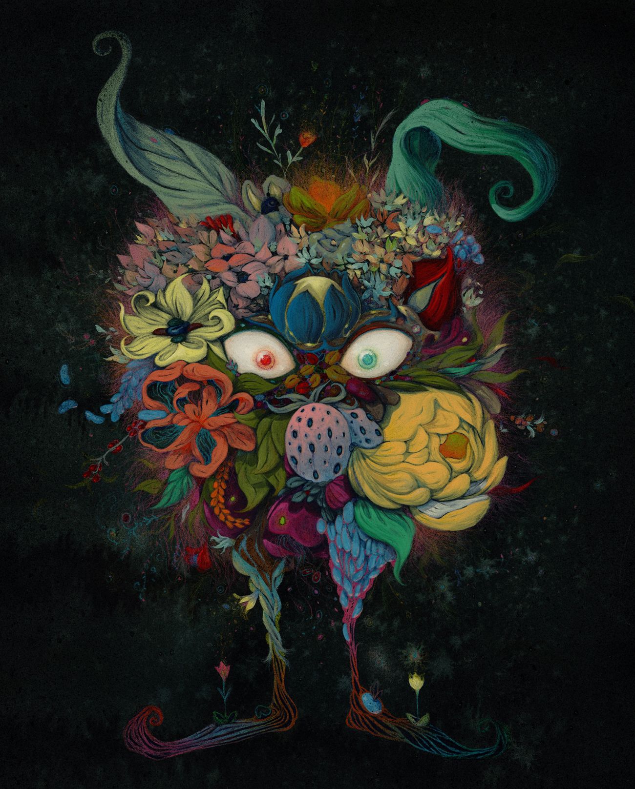 Hacer una serie de dos criaturas a partir de elementos de mi jardín. Imaginando que por la noche todos esos elementos orgánicos se unen para dar vida a estos seres nocturnos que deambulan por el exterior de la casa.