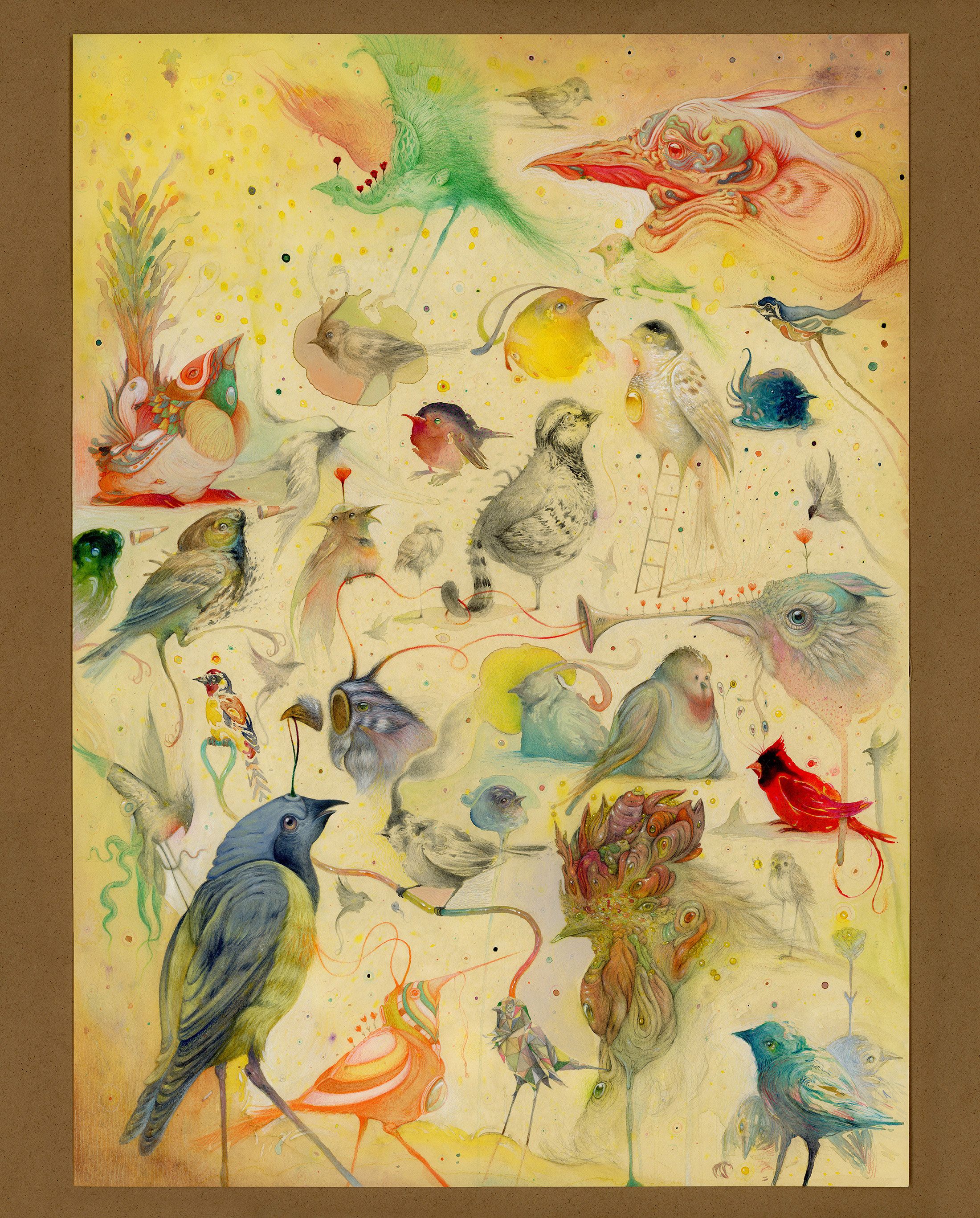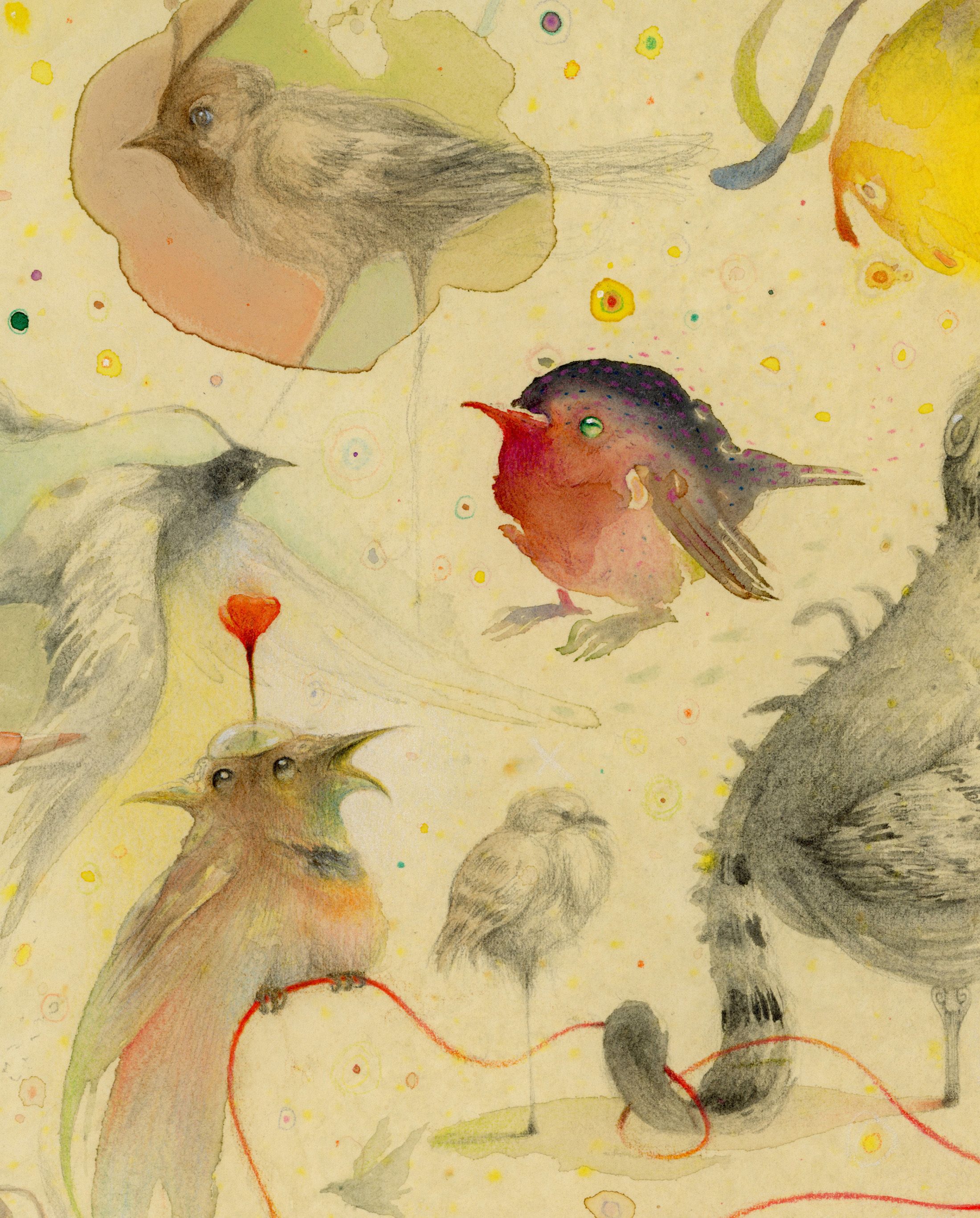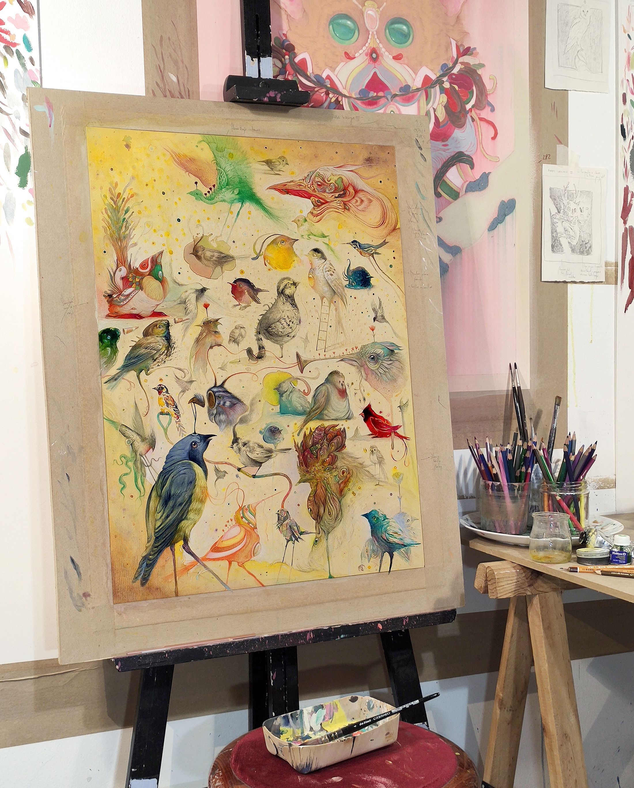 Para hacer esta pieza, partía con esta premisa y sin bocetos previos. Improvisación con una única norma autoimpuesta; Cada pájaro debía tener un proceder y una técnica distinta al anterior, y procurar que todos conecten. Porque la técnica (su parte física, la manera en que se presentan al mundo) no es el nexo de unión. Lo es el diálogo. El diálogo de pájaros.