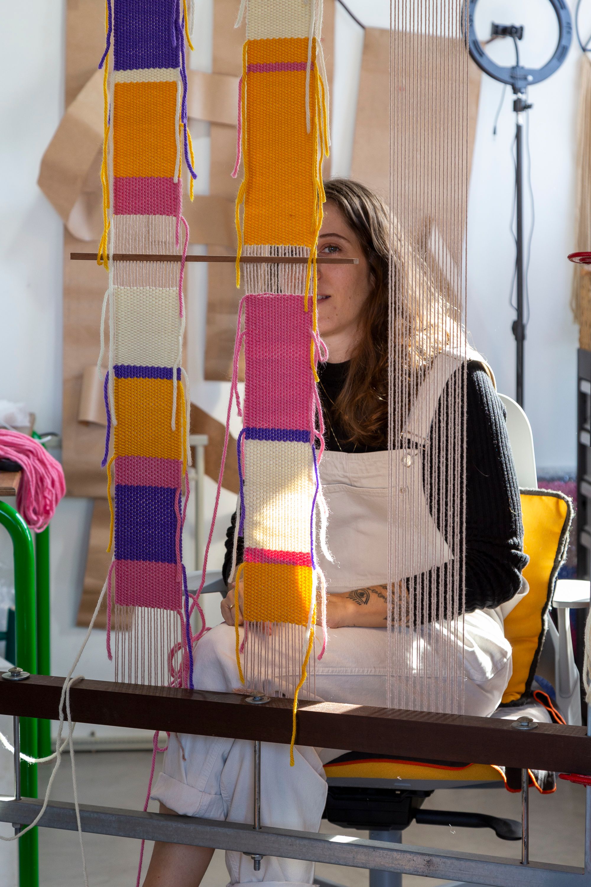 Apresentamos além da tapeçaria de parede, especialidade da artista, uma luminária e uma série de penduradores com caras magnéticas, que podem ser usadas também para personalizar outros produtos do T44.