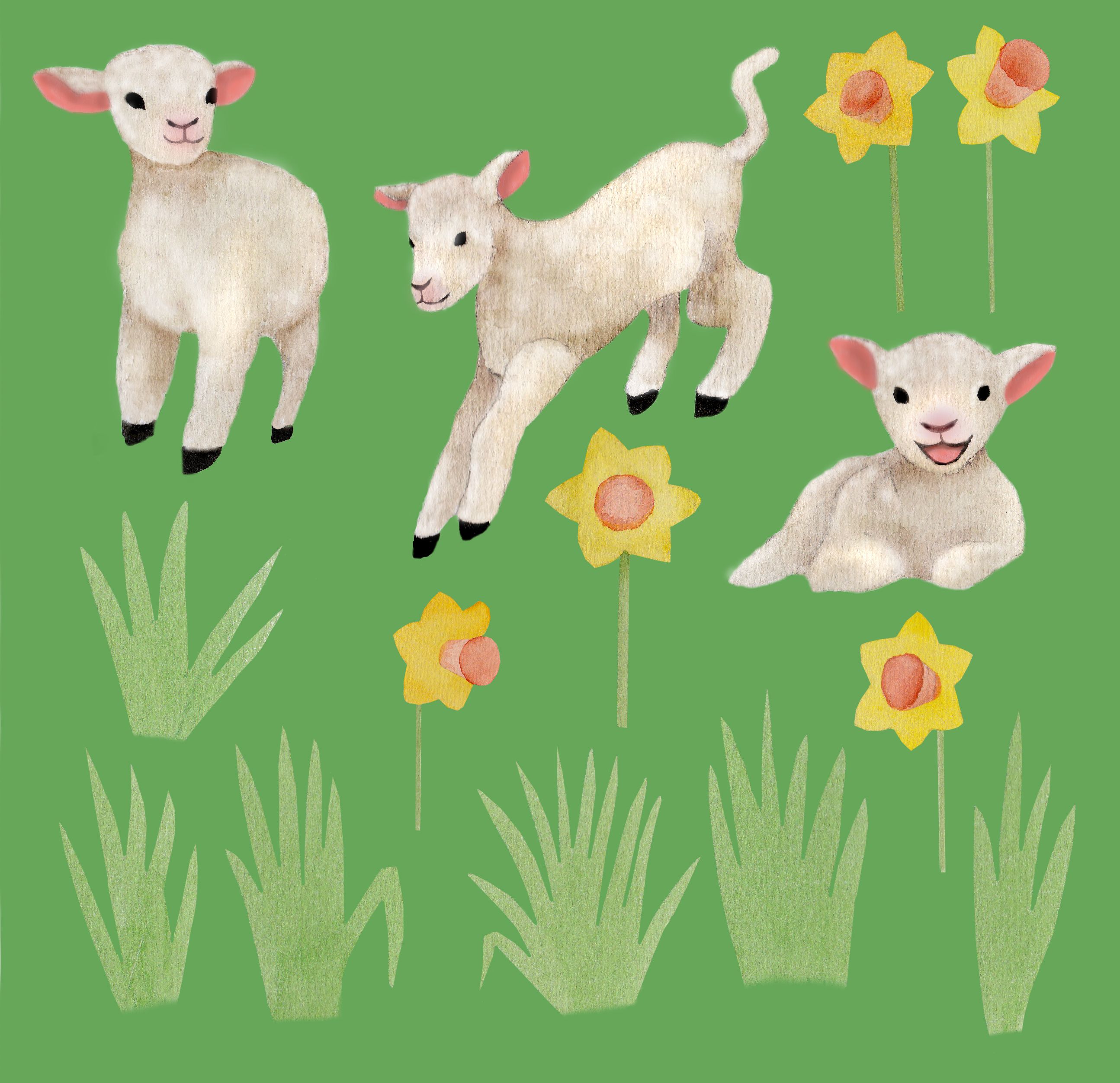 Spring lamb project for some shop windowsUsed sketches to create motifs for double useMt first repeating designNumber two more complex and more subdued colourwayBack to brightsVery pleased with my efforts.