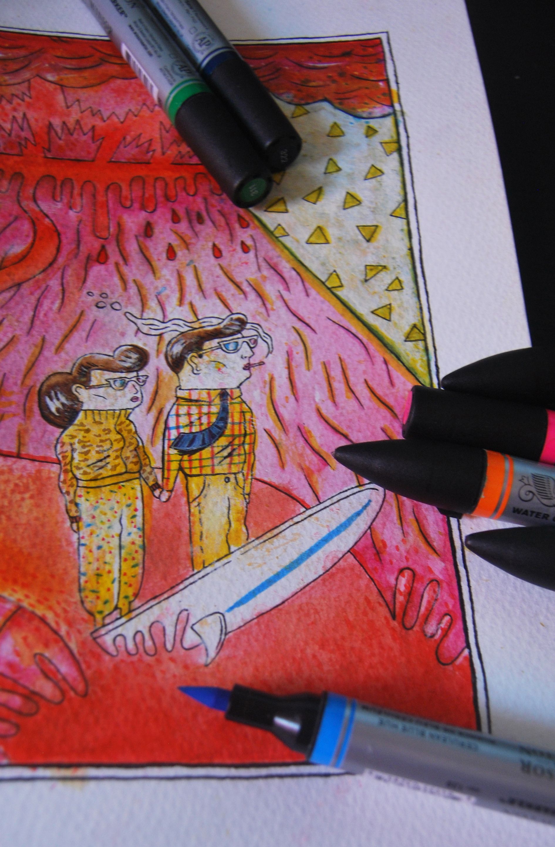La revista Minchó y Winsor&Newton me encargaron realizar una ilustración probando su nueva linea de rotuladores acuarelables. Aqui pongo el dibujo definitivo y algunas de las pruebas que realicé con ellos.
