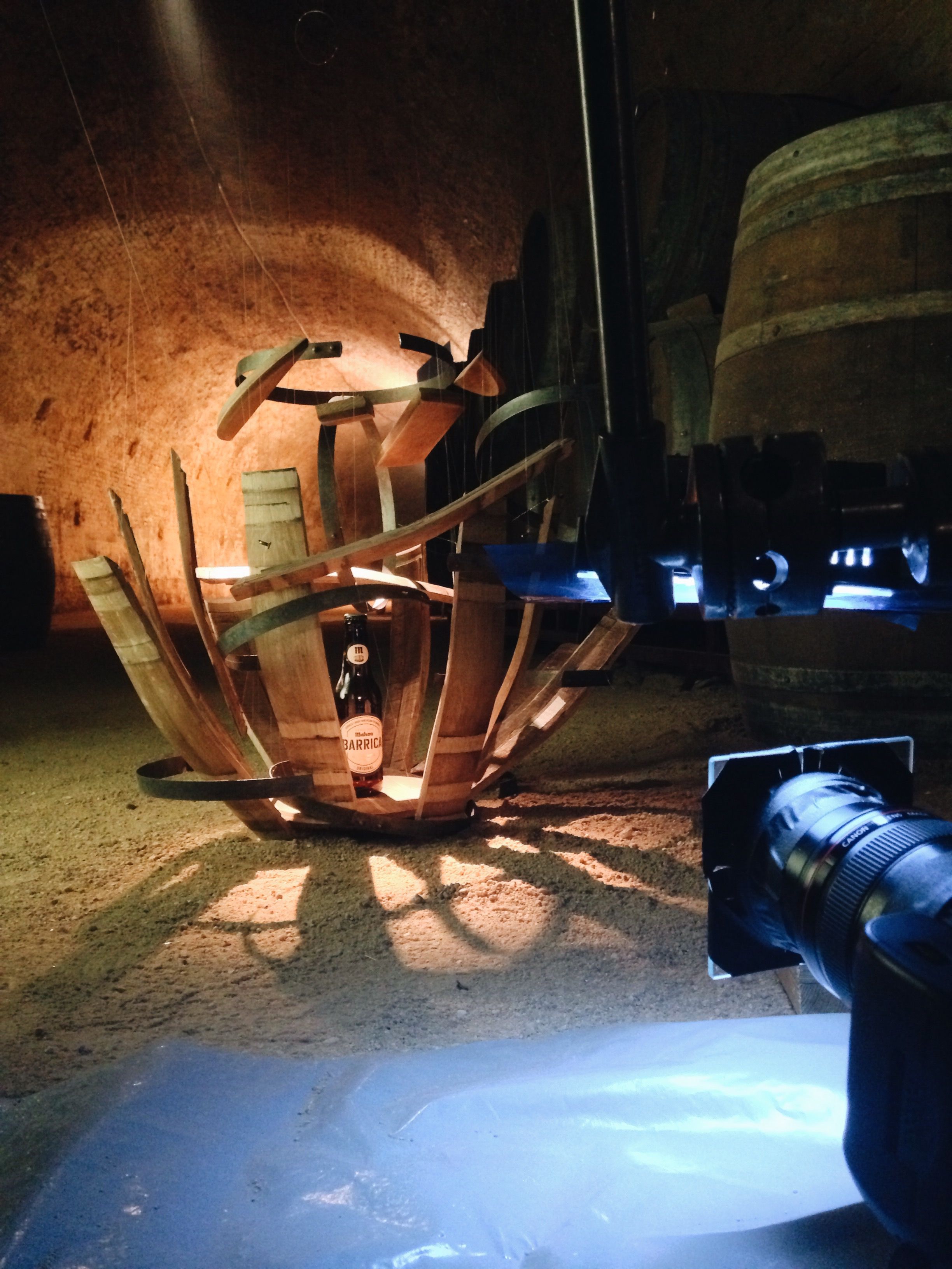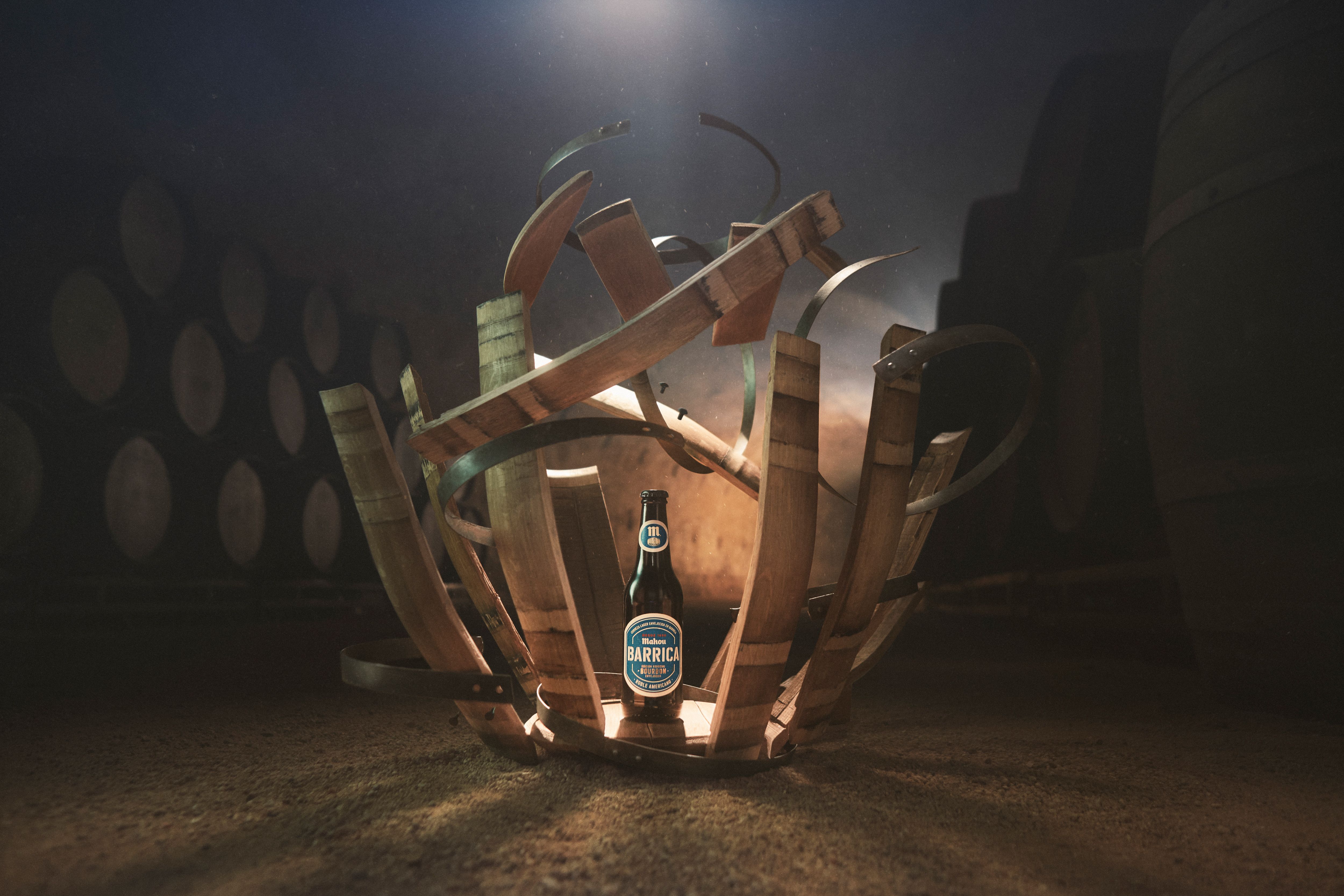 Básicamente buscamos mostrar de forma muy visual ese origen, con una barrica desmontándose alrededor de la cerveza. Construimos la imagen de forma totalmente real, colgando todas las piezas de la barrica en el aire de hilos transparentes. De esta forma la iluminación afectaba de forma real a todas las piezas de madera y a la botella, consiguiendo un resultado creíble e impactante. Y por supuesto, mucho más divertido de hacer :)