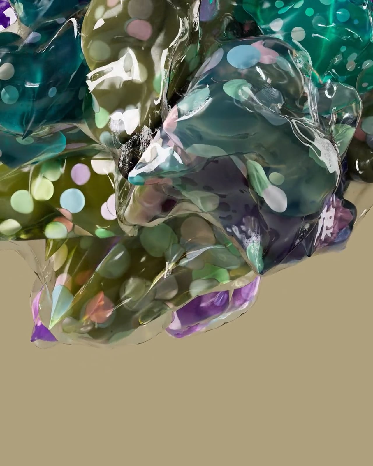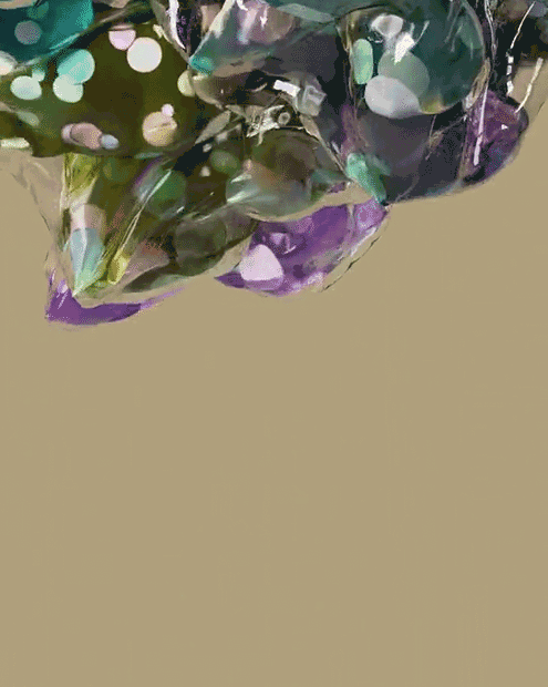 Various plastic letters inflate and deflate, stretching until they fall to the ground. It is an optimism for human society, everything plastic must fall.