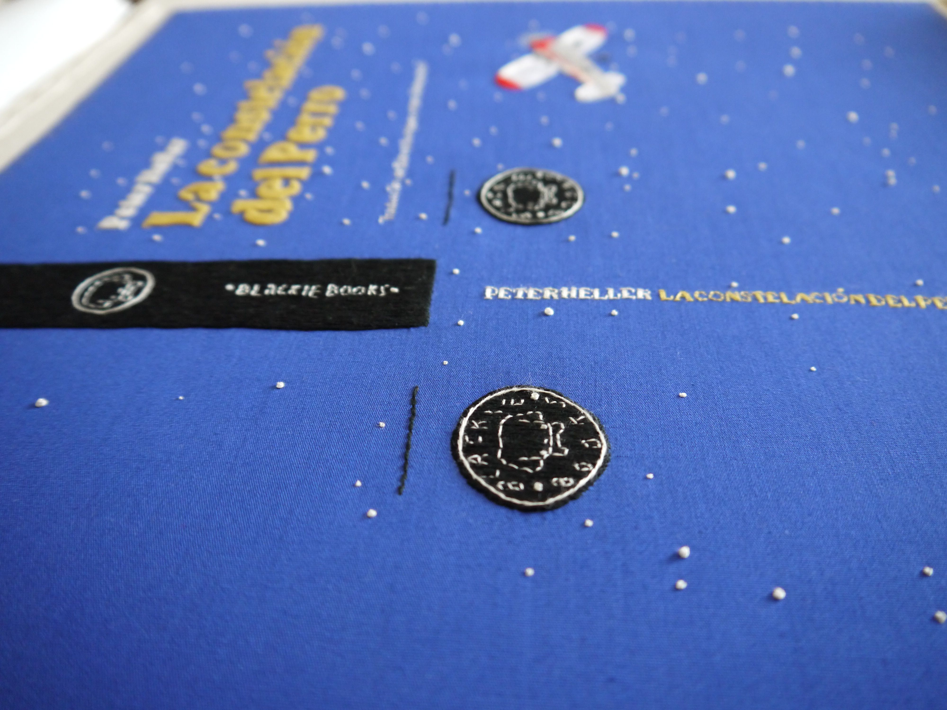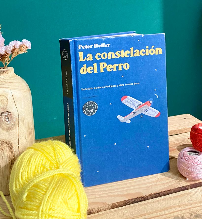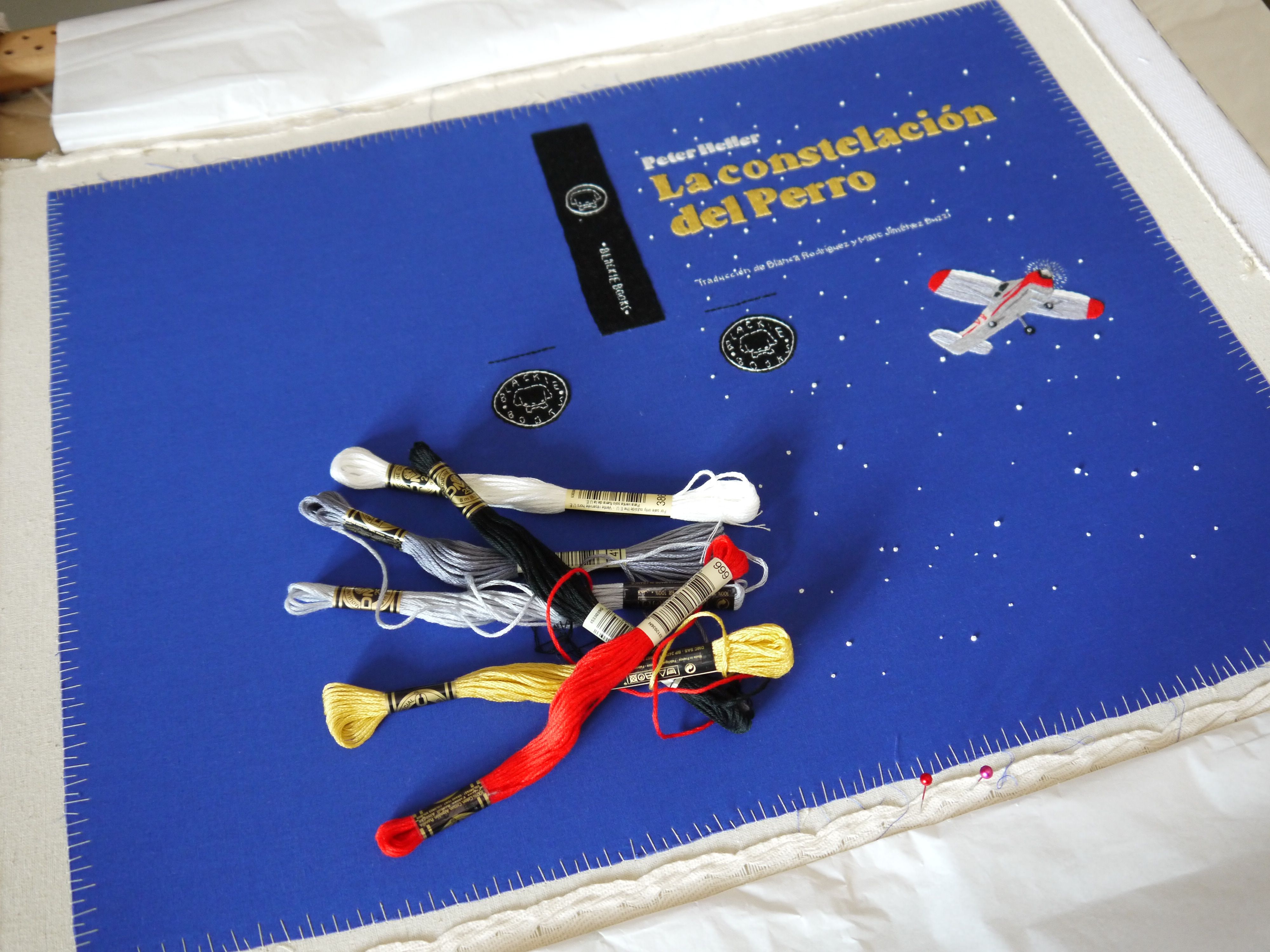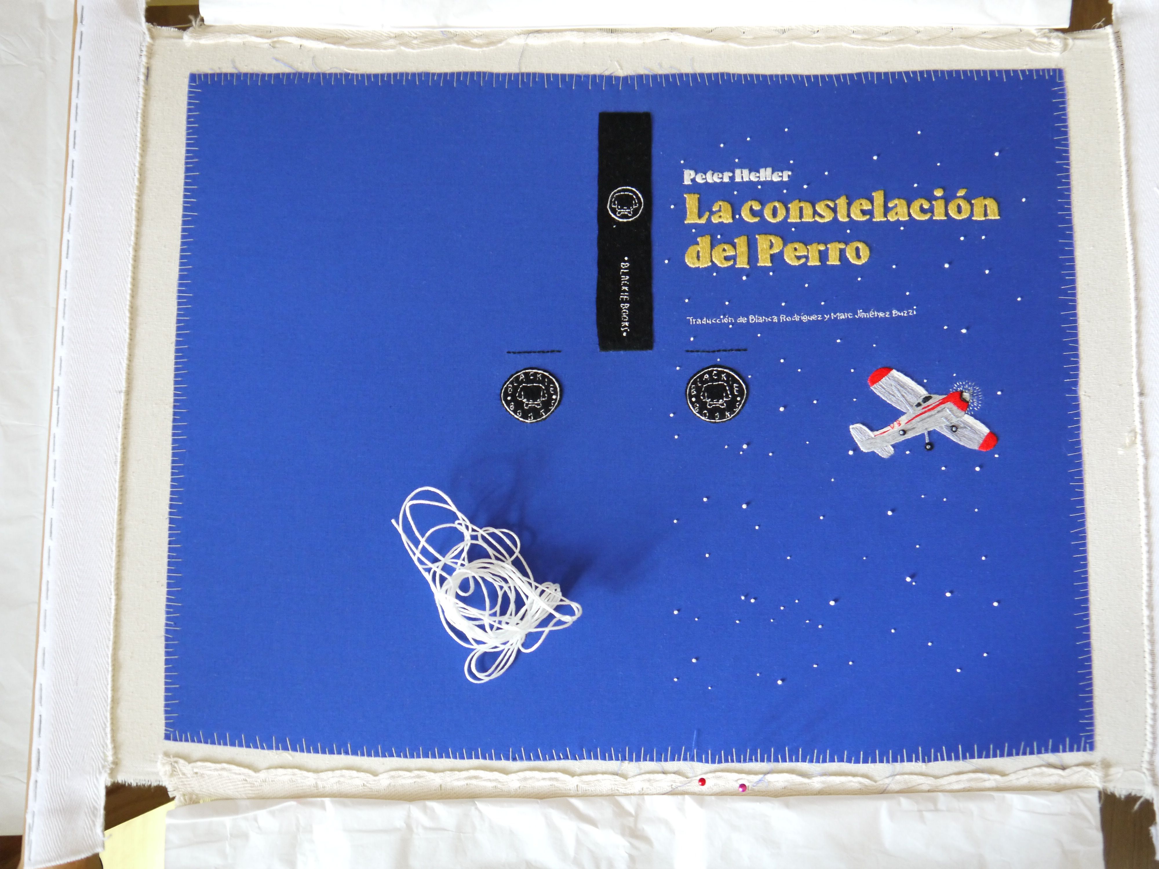 Desde Blackie Books me propusieron bordar la portada para una de sus grandes apuestas de ese año, la novela “La constelación del perro” de Peter Heller. En una distopía donde los humanos casi se han extinguido, el protagonista sigue ahí, con su perro y su pequeño avión Cessna queriendo continuar y cambiarlo todo.
