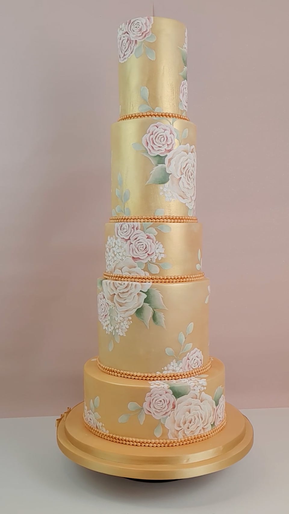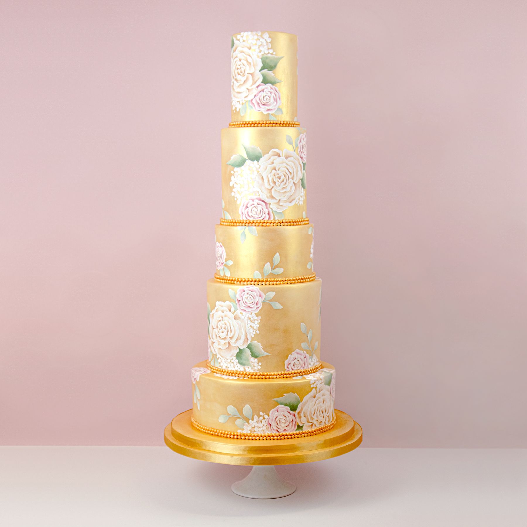Metallic gold wedding cake with hand painted peonies