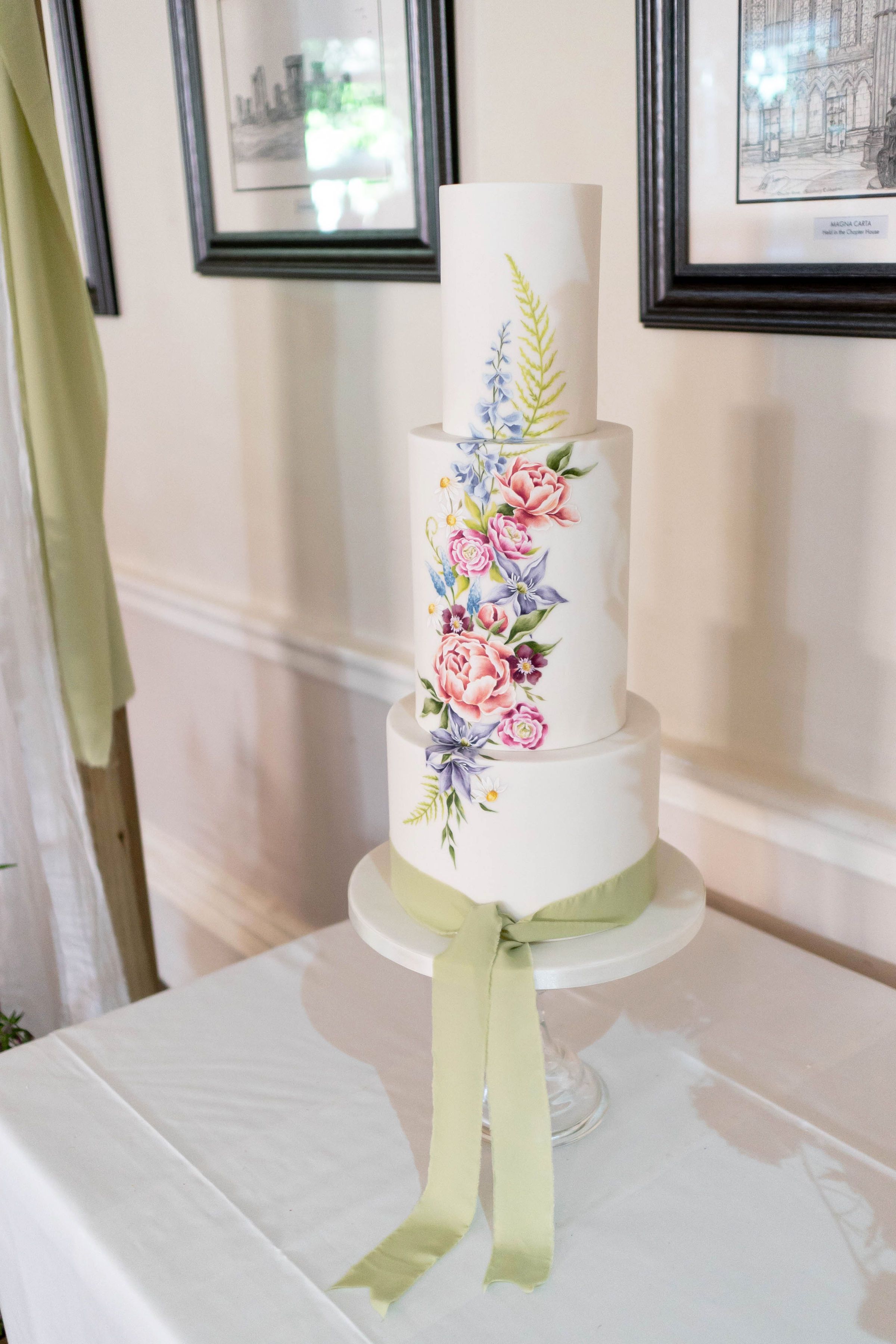 This 3 tier real wedding cake was inspired by colourful spring flowers and was hand painted using cocoa butter paint onto sugarpaste.