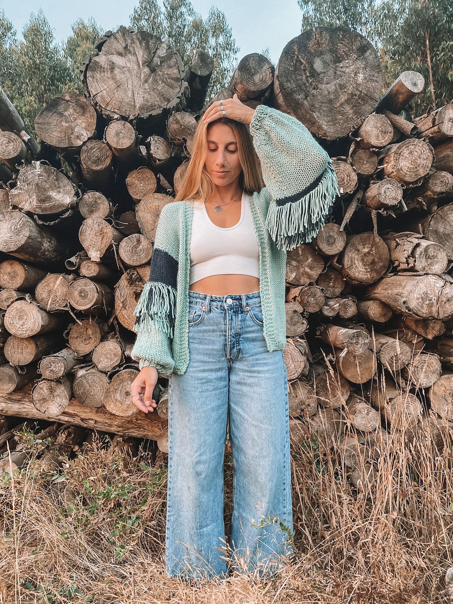 Me imaginé de una en un Cárdigan, de esos chalecos simples, pero que te arreglan el outfit. Por eso diseñé este Patrón con puntos simples, pero con un detalle de cambio de color y flecos en las mangas que hace que se vea el complemento perfecto para esos días que quieres vestirte más casual.