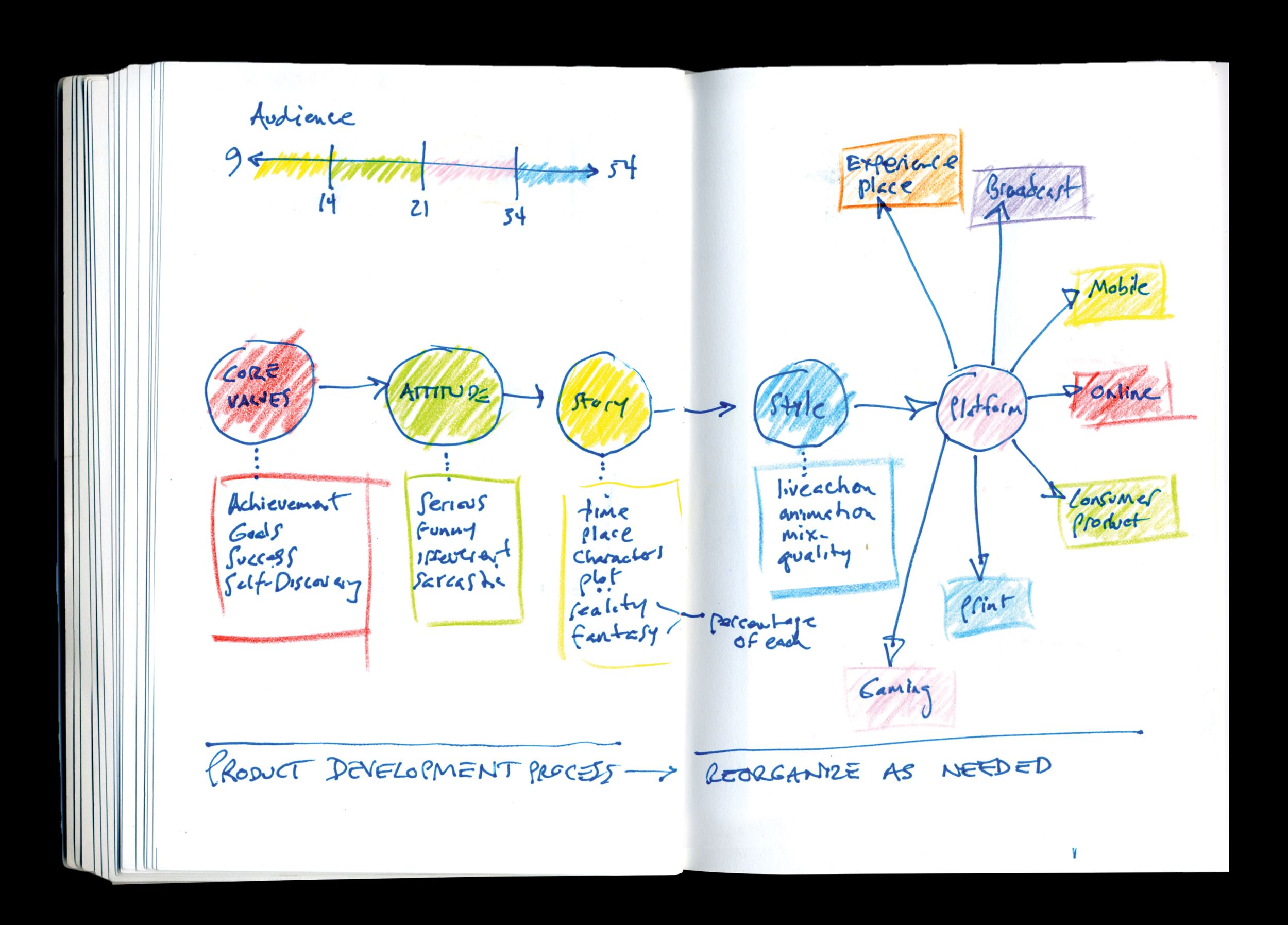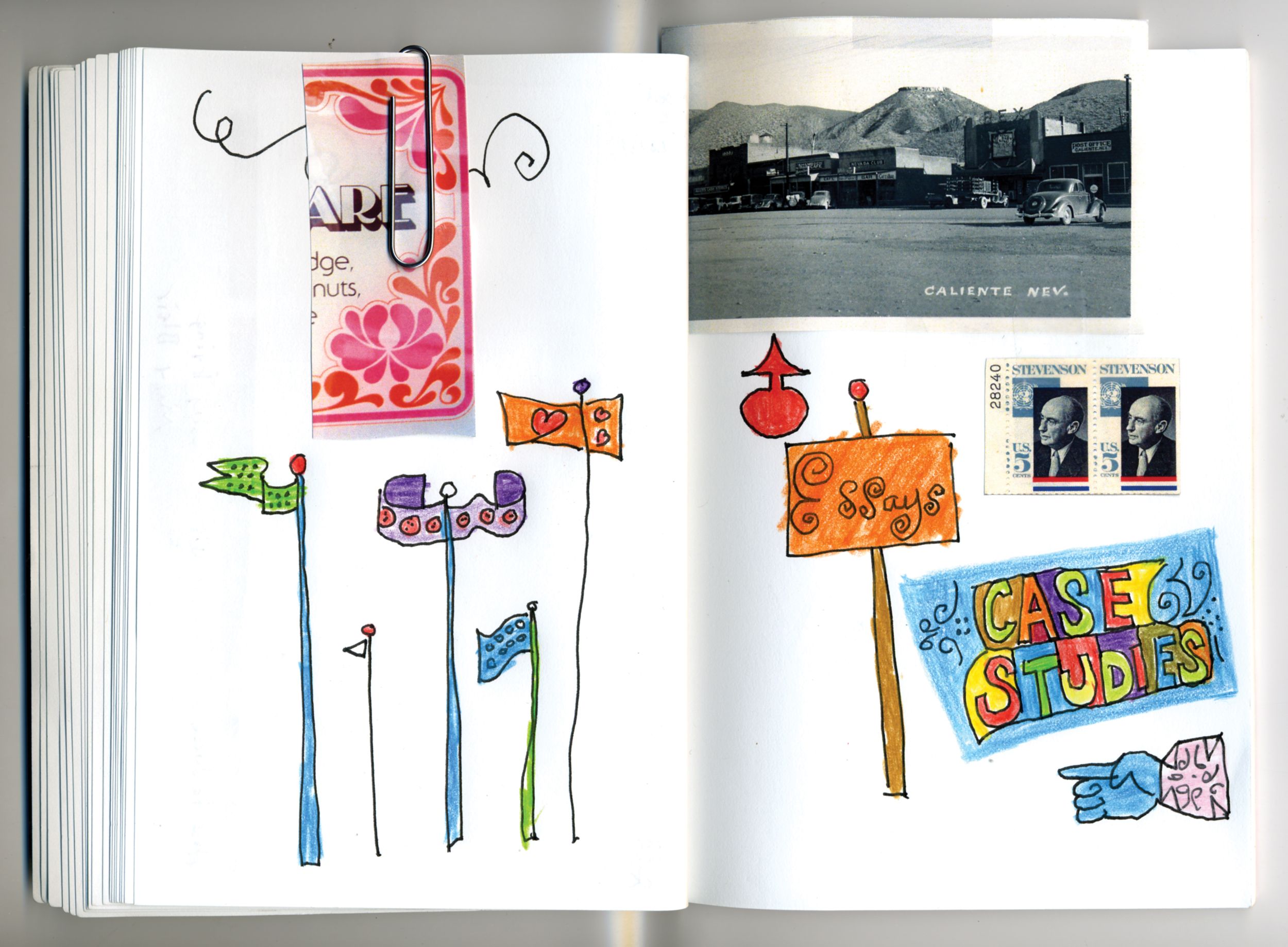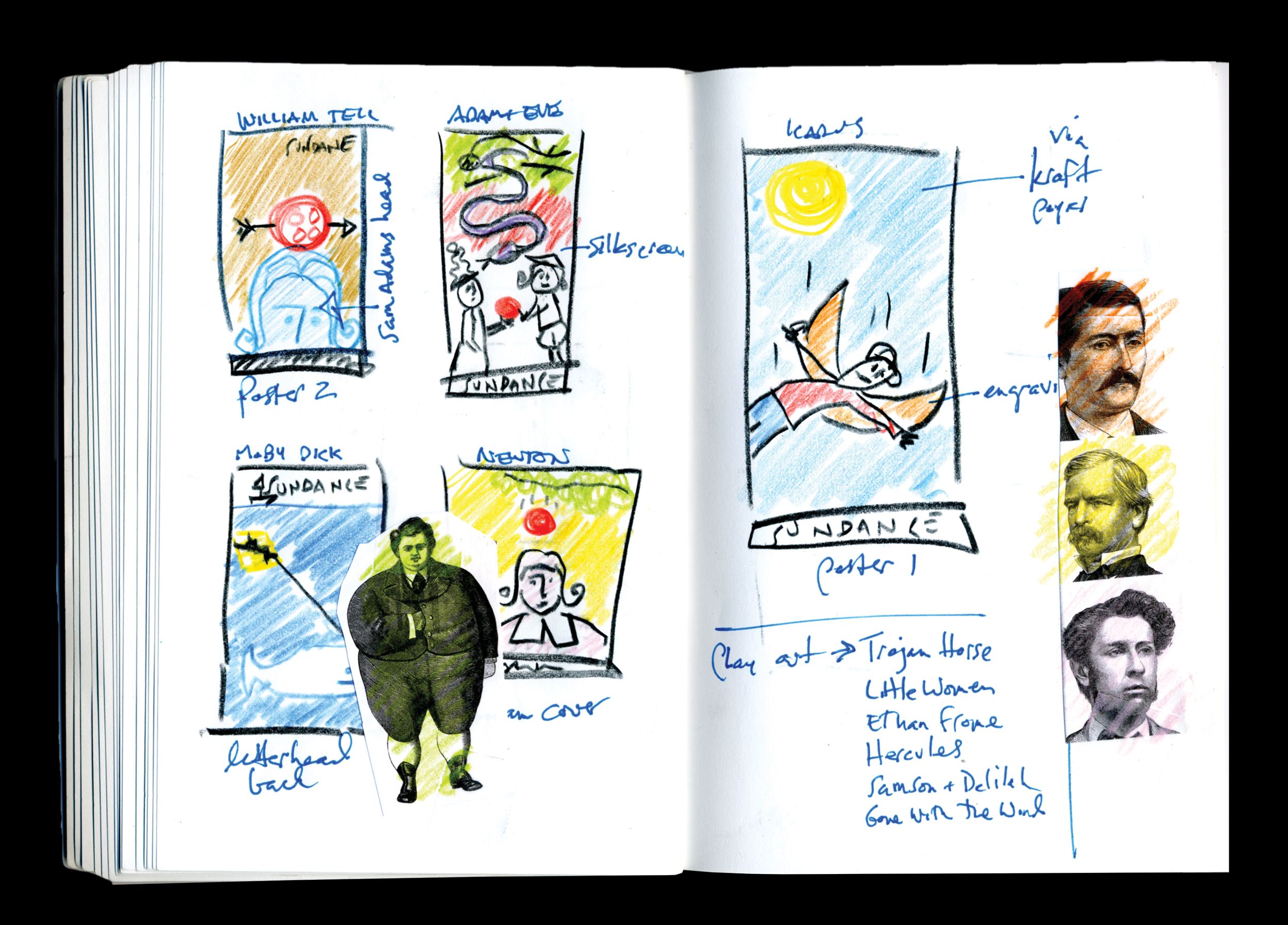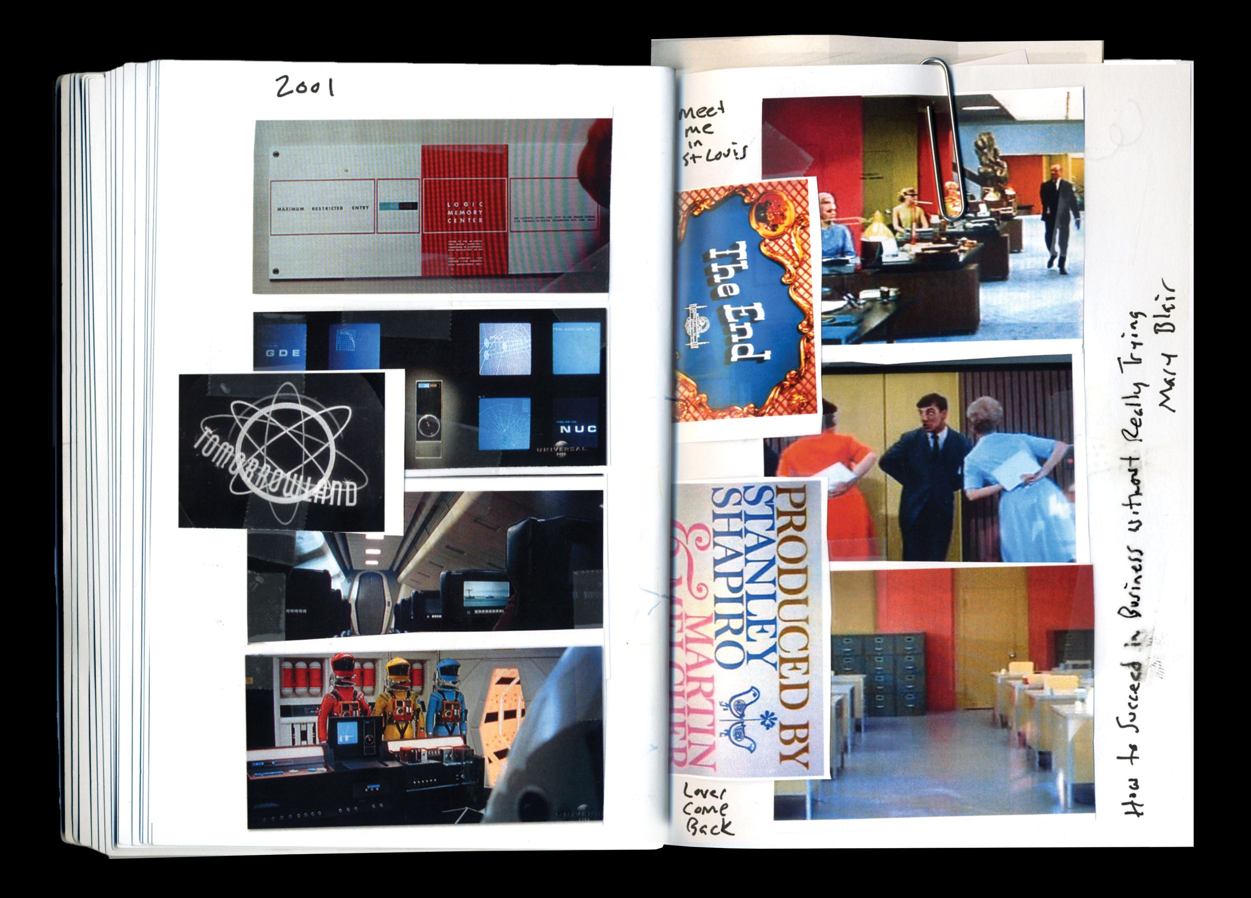 I designed a series of covers and had them printed, then filled with blank sheets. It's a great leave-behind gift, and I have an endless supply of notebooks. I carry a notebook to jot down thoughts, sketch ideas, or write grocery lists. Some of my sketches are so bad that I write what they are to understand later. If I see something I like in a film, like a color palette, I shoot the screen, print the image out, and tape it into the book. Quality is less important than keeping a record as a reminder.