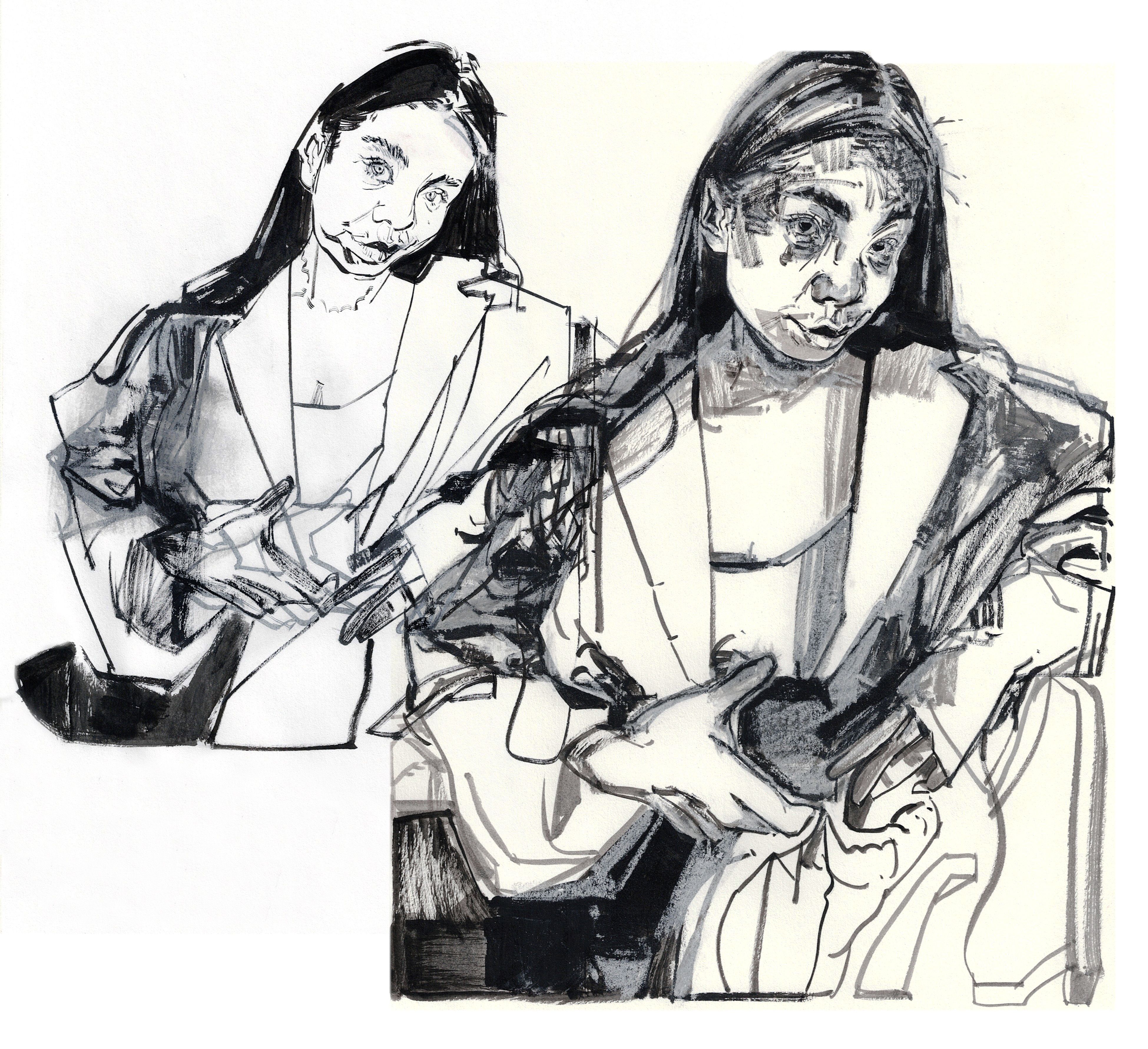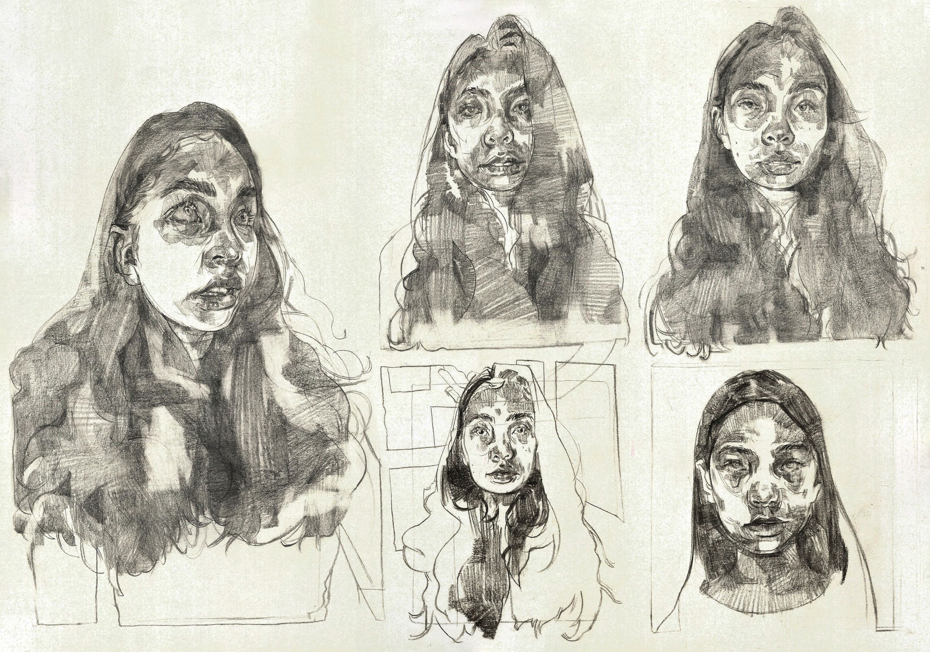 Collage of drawings in wax pencil on mylar paper.Drawings in graphite and charcoal pencil on moleskine paper.Drawing in ink and chalk pastels on toned dotted paper. Digital and mixed media.Drawing in ink on copy paper.Collage of drawings in ink and chalk pastel on copy and cardstock paper.Drawing in ink and chalk pastel on copy paper.
