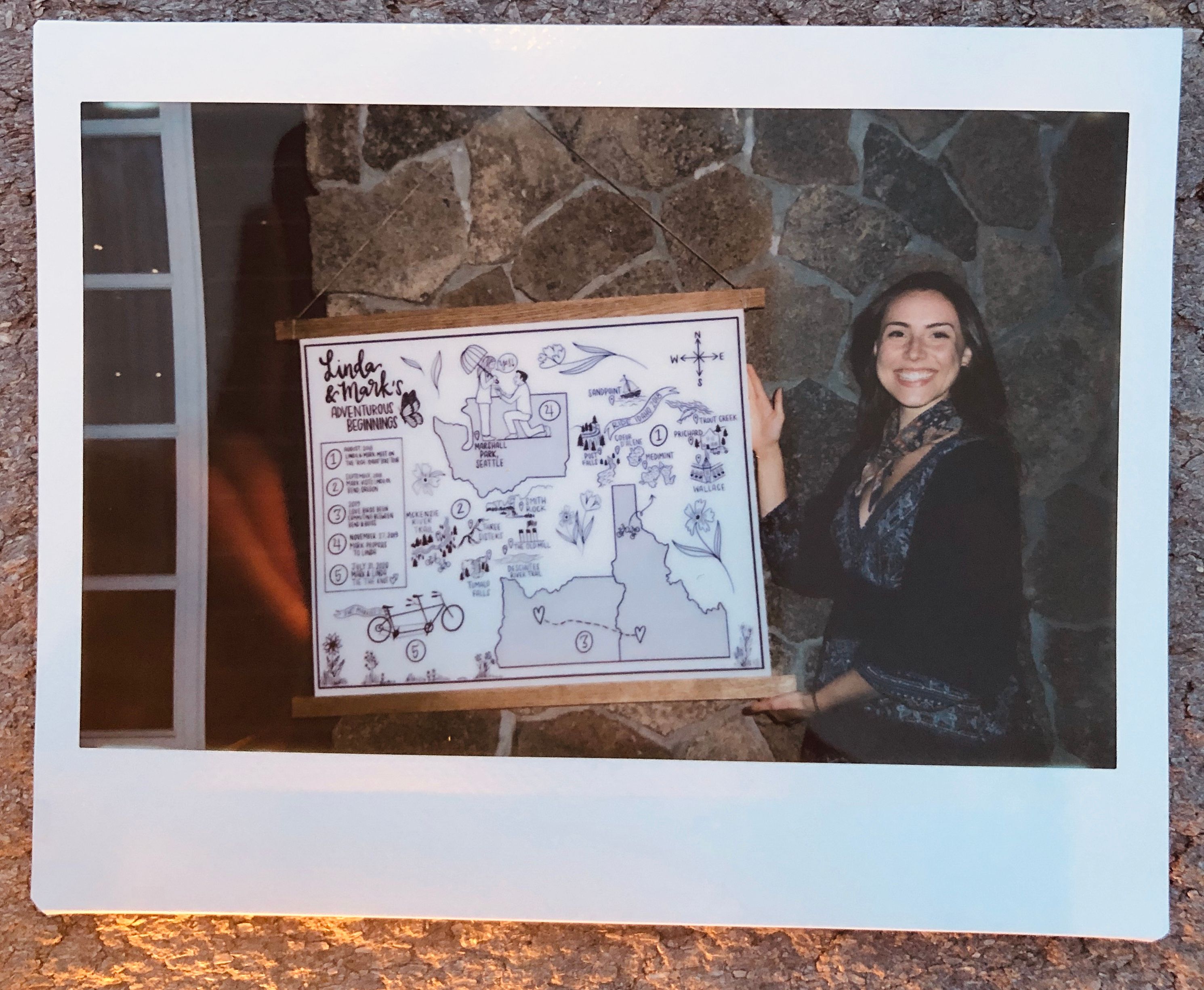 I drew this illustration on procreate and then had it printed on canvas and glued the wooden fram to it. It’s a map of all the dates my friends went in before they got married!