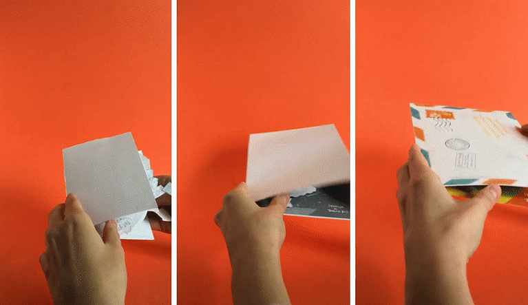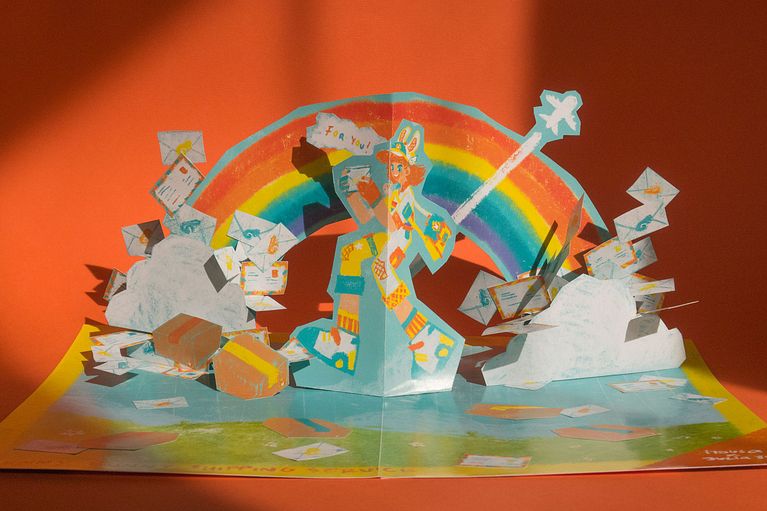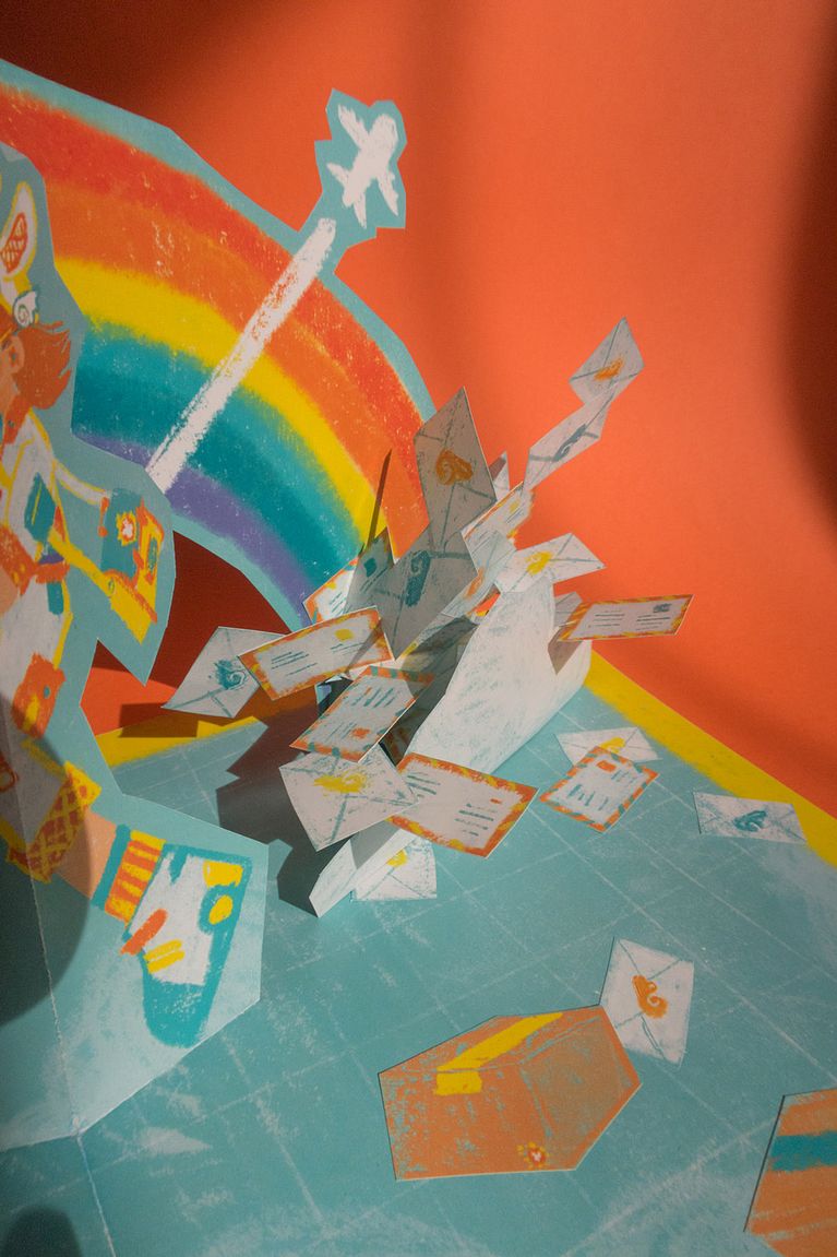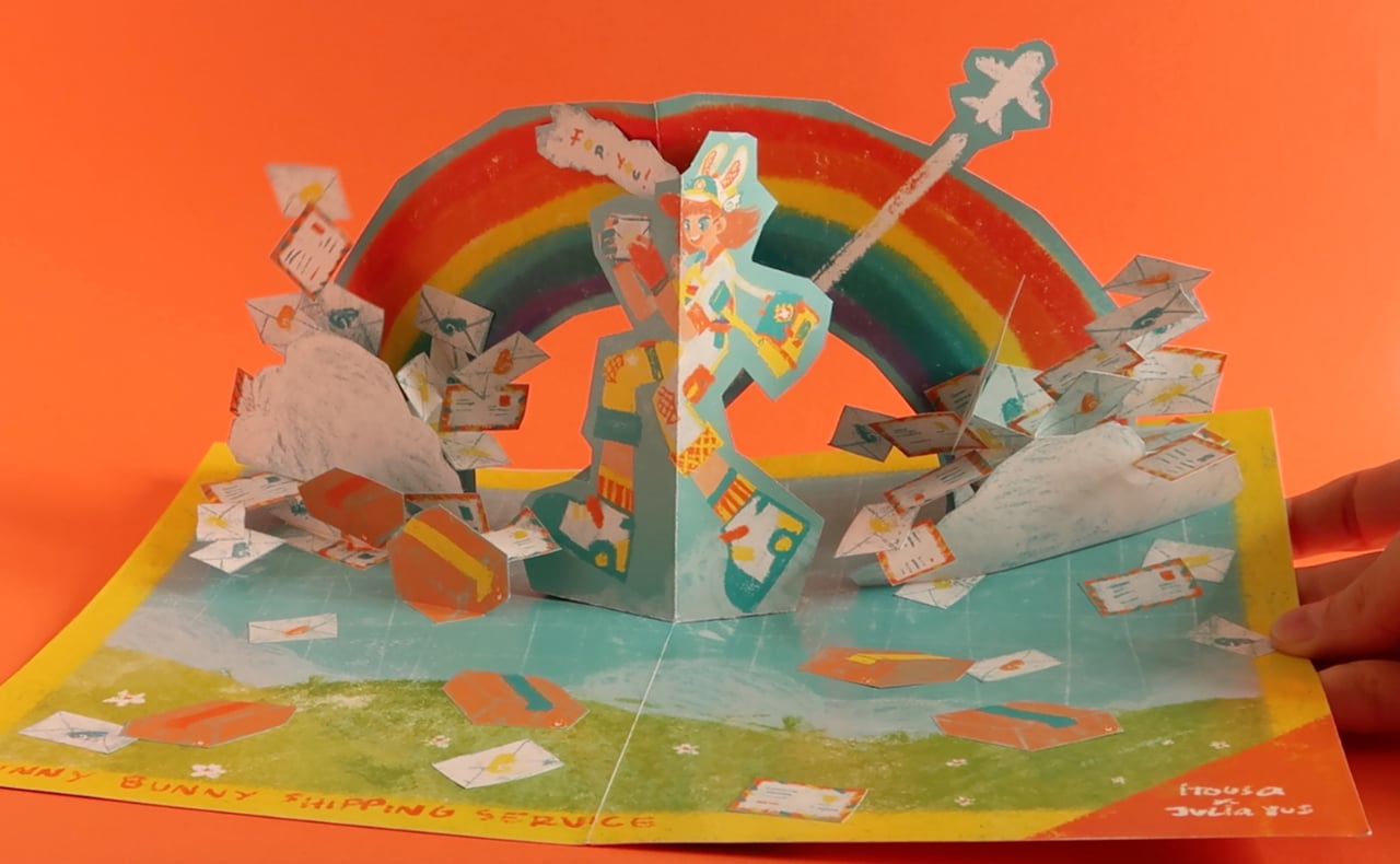 El reto fue sencillo: la ilustración de itousa estaba llena de detalles e ideas para crear los diferentes planos de la tarjeta. Por una parte, el personaje principal en primer plano. Detrás podemos encontrar una explosión de sobres y cajas de envíos. Por último y en el plano posterior un cielo azul y un brillante arcoíris.