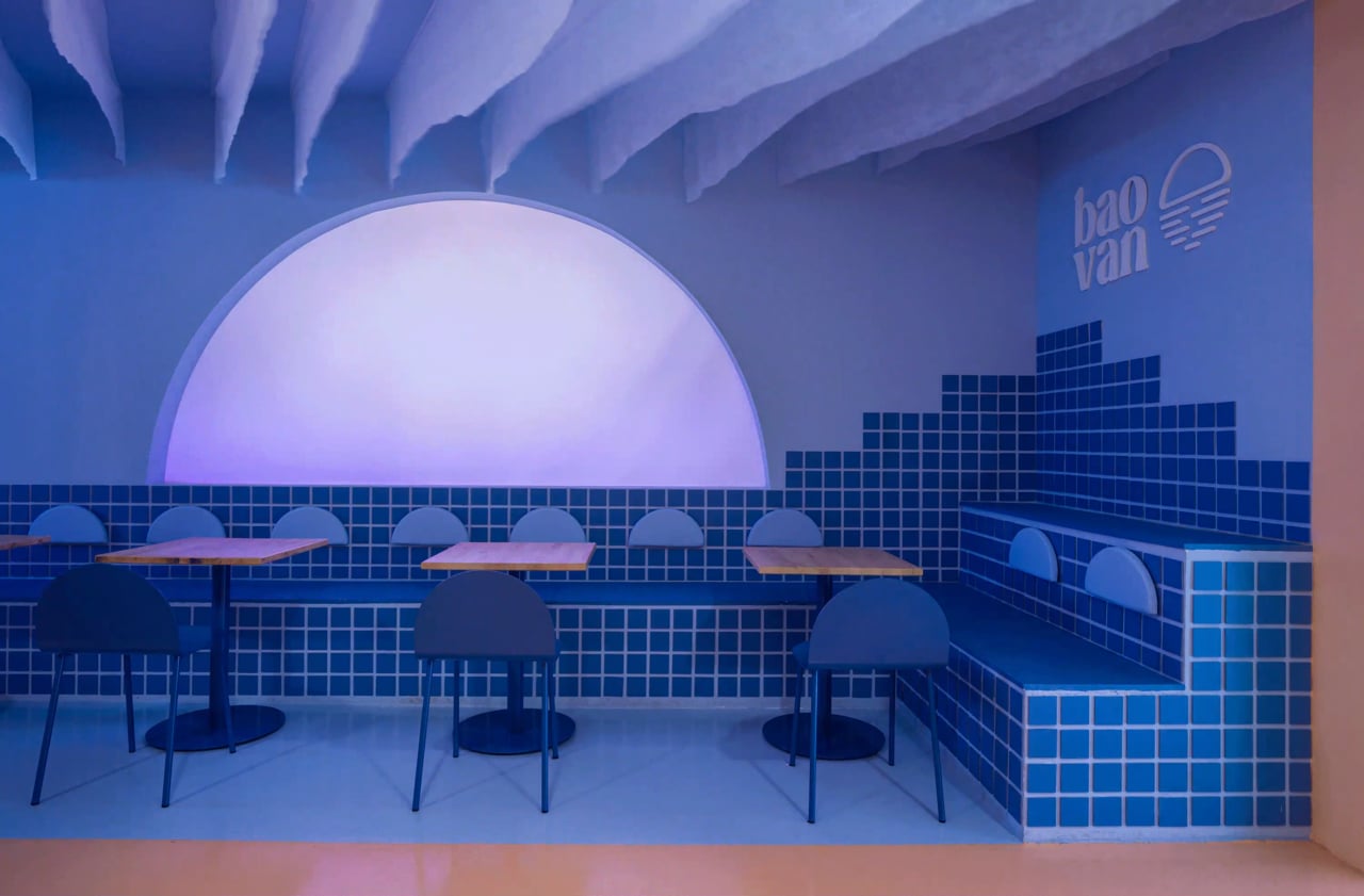 Las formas redondas y de semiluna inspiradas en la forma del pan bao se repiten en todo el espacio. Desde las ventanas que conectan el exterior con el interior, pasando por la instalación lumínica hasta las sillas de Baovan diseñadas exclusivamente para el restaurante que representan la forma de un pan bao abierto.