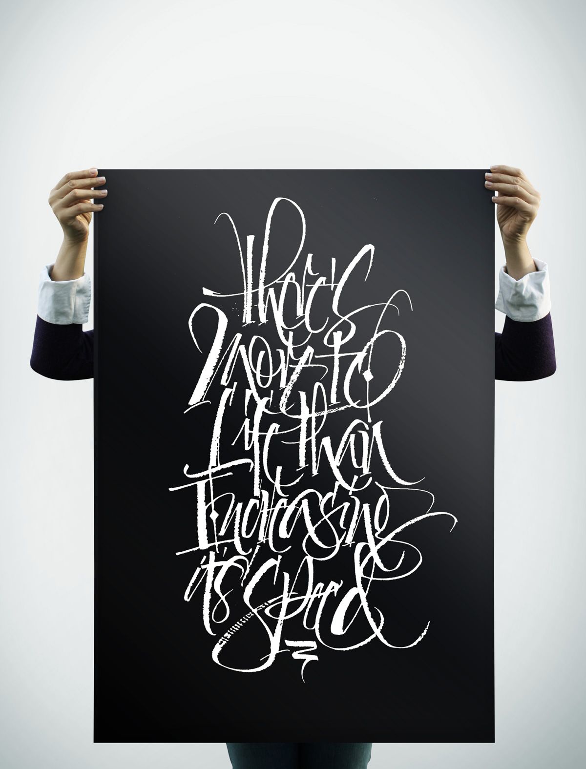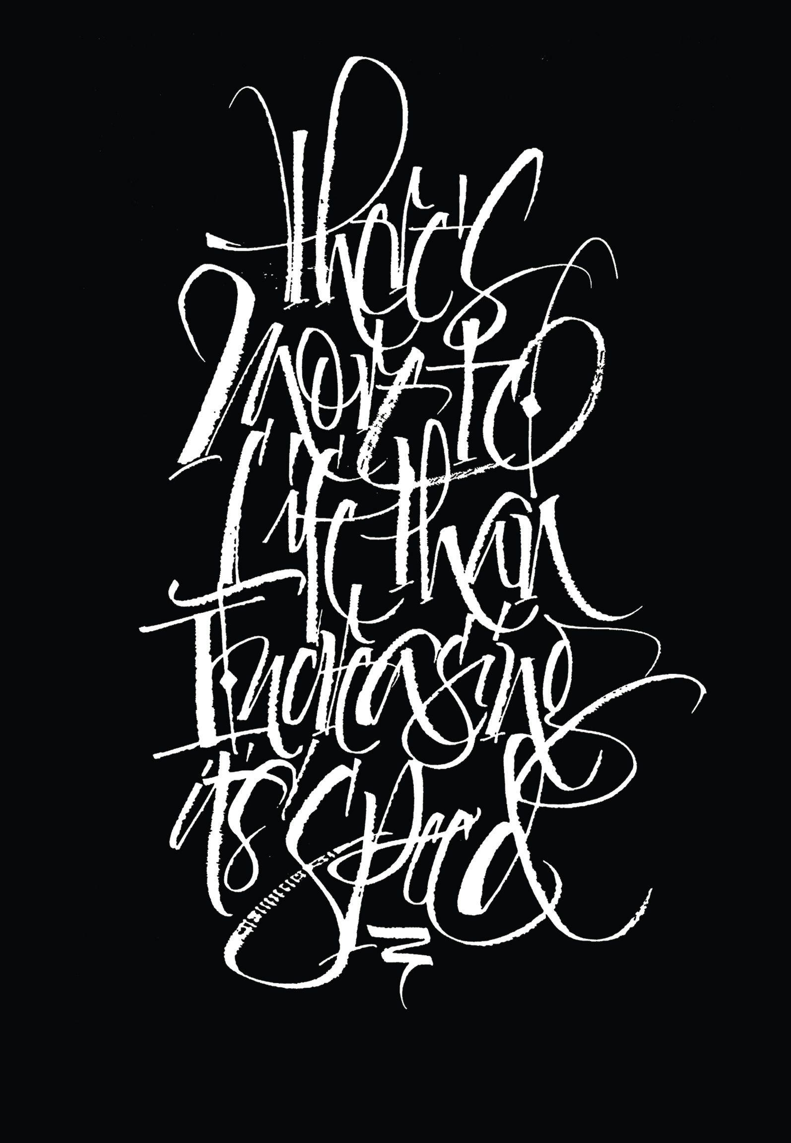 Proyecto presentado para la segunda edición del libro Typism de edición Australiana. Es una caligrafía a mano alzada con tiralineas y tinta china, "There's more to life than increasing its speed" es una cita de Mahatma Gandhi.