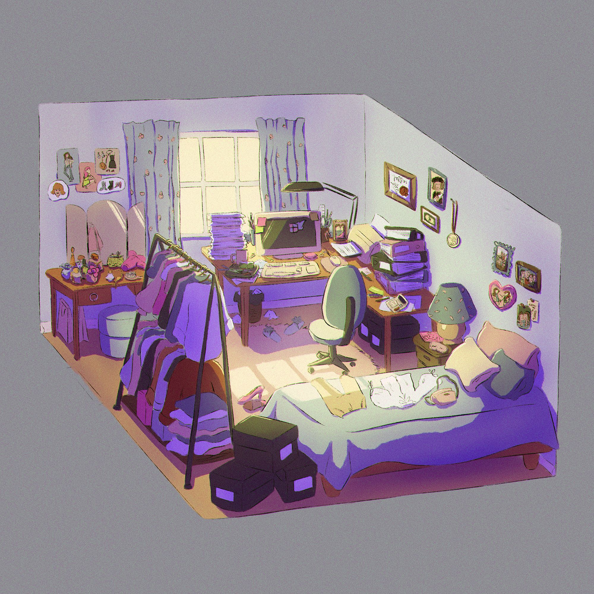 This is super cool, I really love the details of the windows screen on the computer and the clothes on the bed. It really fits the briefing and it has a lot of personality and life to it! :D