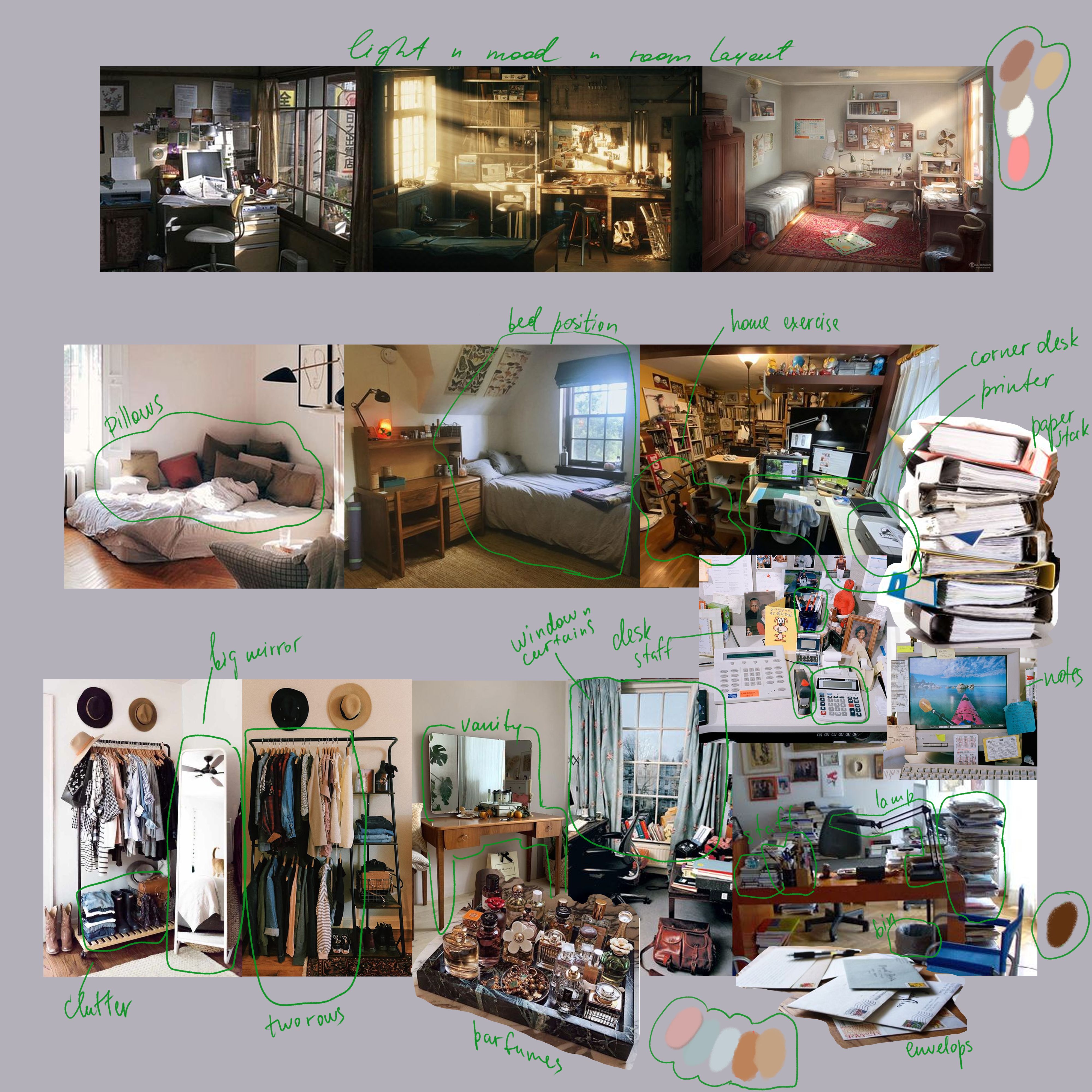 Her room includes a bed, work desk, a rack bursting with clothing, and a vanity. The time is 8 am, and she is taking a shower before meeting with a client. Her outfit is laid out prepared on the bed. There is a laptop, stacks of paperwork, regulation manuals, and unfinished breakfast on her desk. Morning light is coming through the window. Her diploma and first earned dollar are proudly framed on the wall next to joyful group photos with her girlfriends.