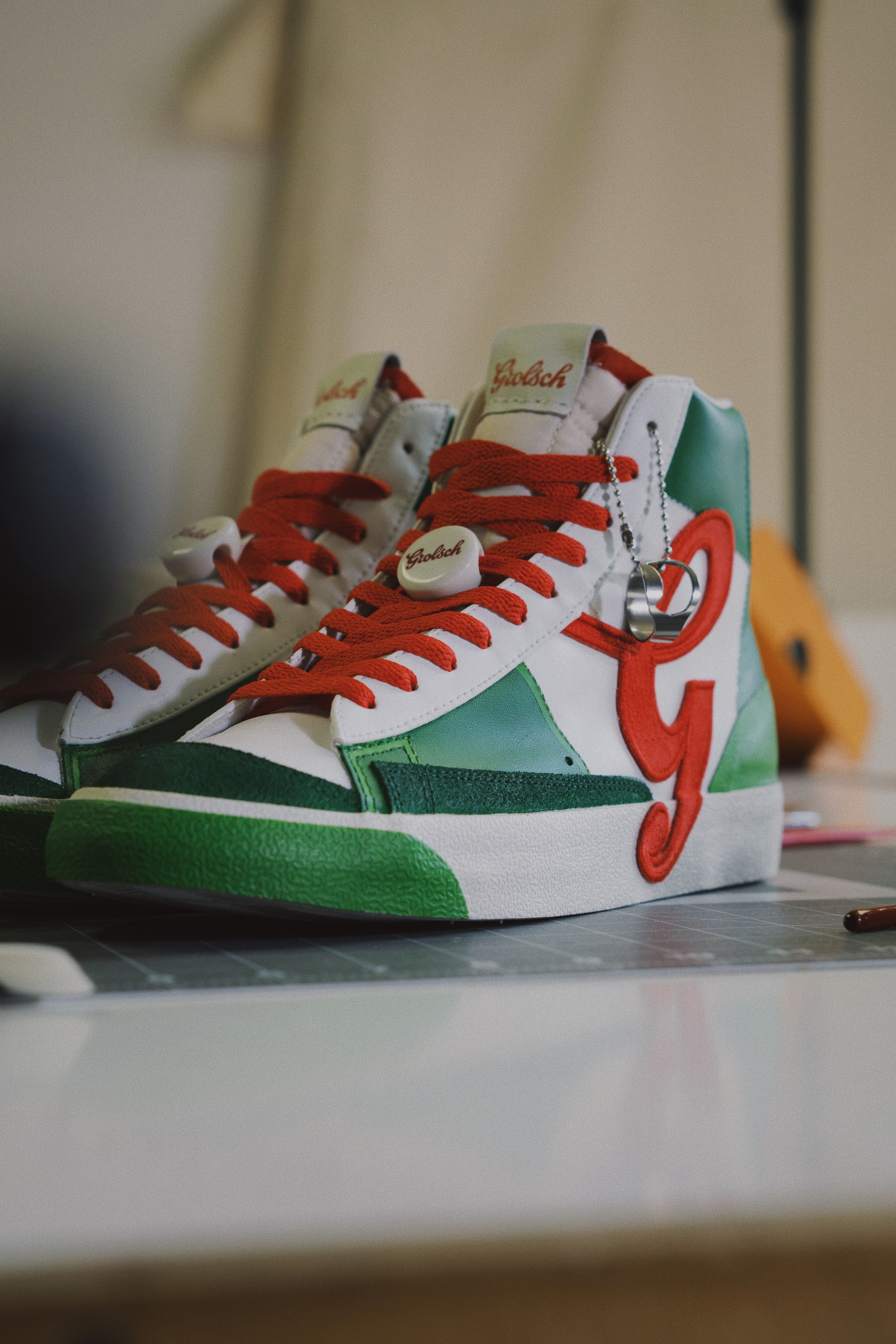 Custom para cerveza Grolsch, enfocado en sus colores de marca y reflejadas en las zapatillas de una manera elegante y fácil de vestir.