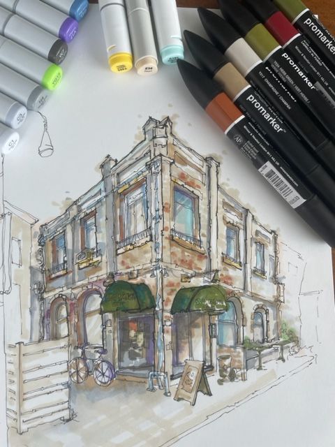 Wonderful sketch Maria!! This looks great, and I love your progression. It shows you understand the concepts of working in transparent layers and then finally adding the highlights. Excellent! This also would be great to share on local social media. I am sure you will get a lot of responses from people that know this cafe (and of course the owners themselves!!)