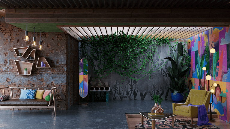 Initially, we were asked to design some vibrant and quirky spaces that felt a little more eclectic in decor and slightly grungy. Below are some of the style frames we made in that direction. This style was eventually scrapped in lieu of a more minimalistic approach to the spaces with a calming feeling to them.