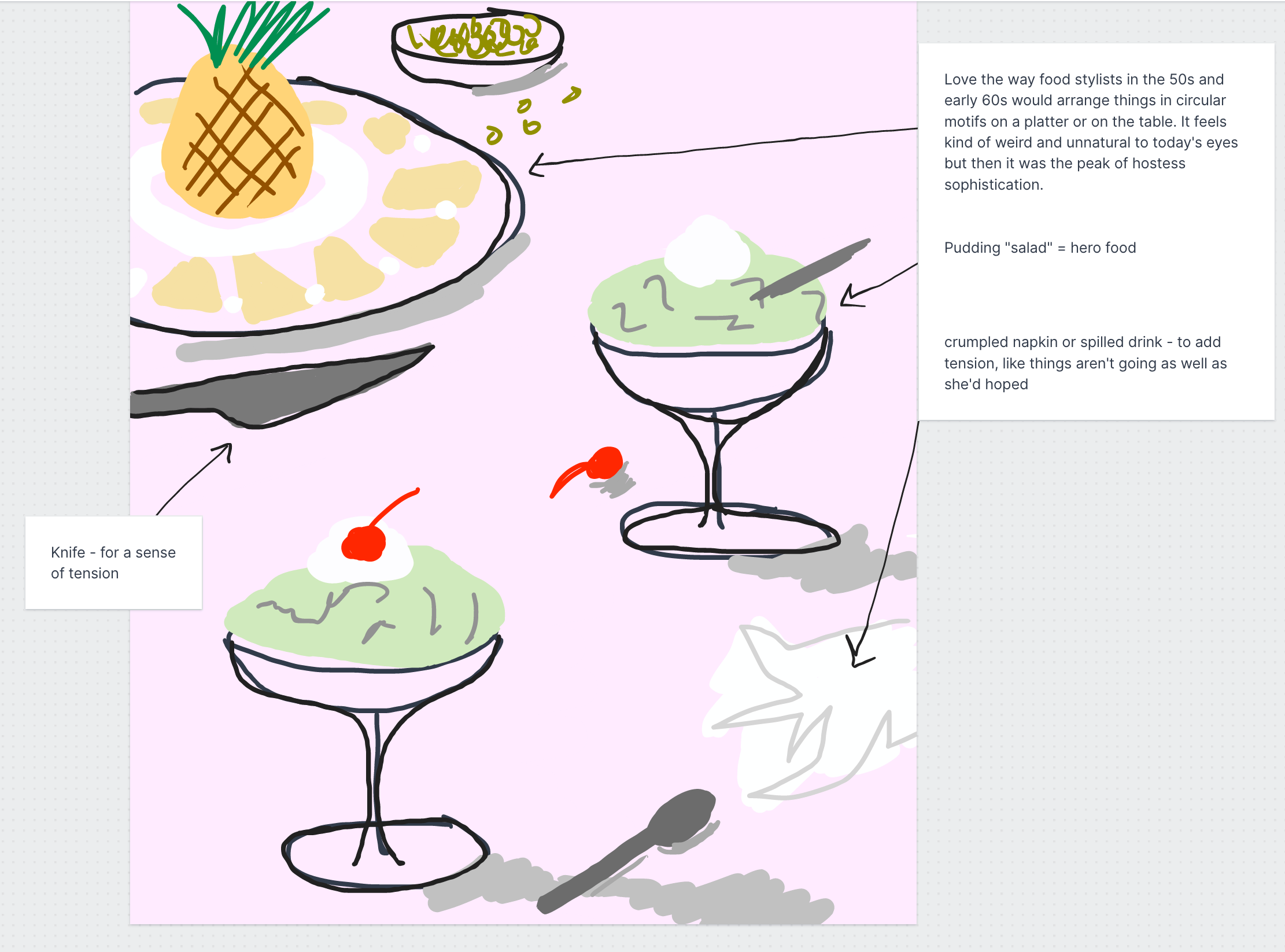 As I refined my narrative and created a moodboard, I decided to go for a look that was feminine and hinted towards the style of late 50s/early 60s, but wasn’t overly kitchy. During my research, I was somewhat crushed to find out this wasn’t an original great-grandma Lois recipe. It was actually a fairly popular recipe of the time and is also known as Watergate Salad or Green Cloud.