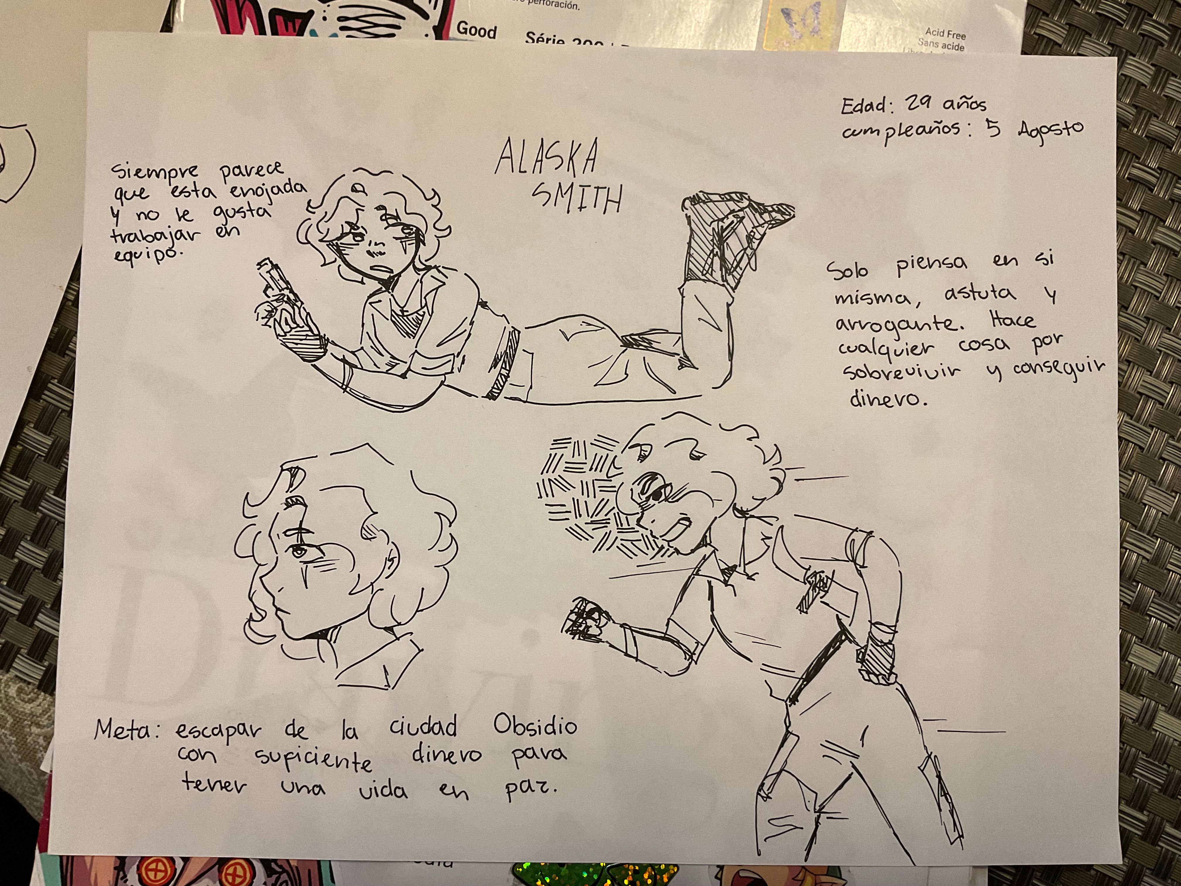 Una chica de 29 que se mete en muchos problemas por intentar sobrevivir en una ciudad problemática de por sí como si fuera ciudad gótica de Batman. Tiene cabello corto azul obscuro, una cicatriz en su ojo izquierdo que parece siempre fruncir el seño.