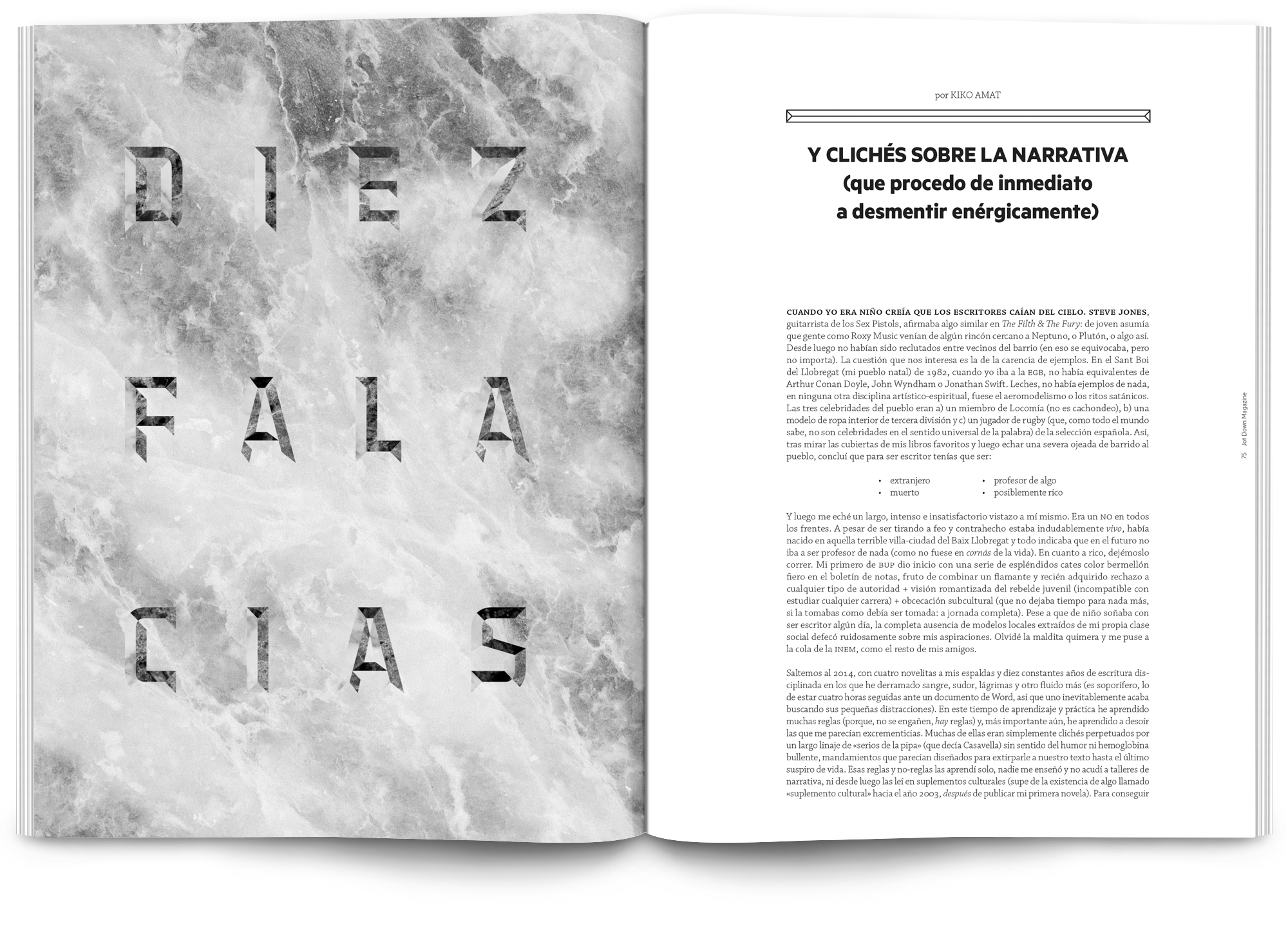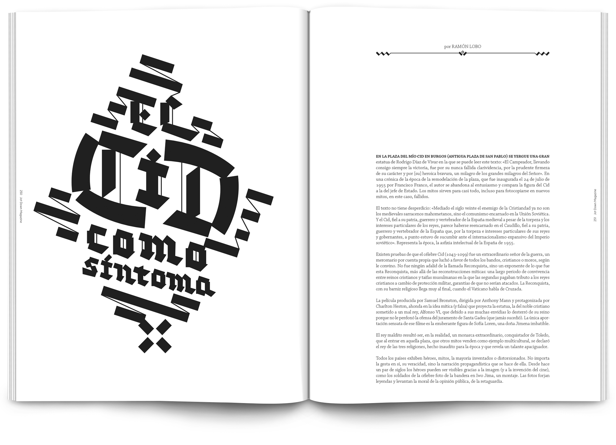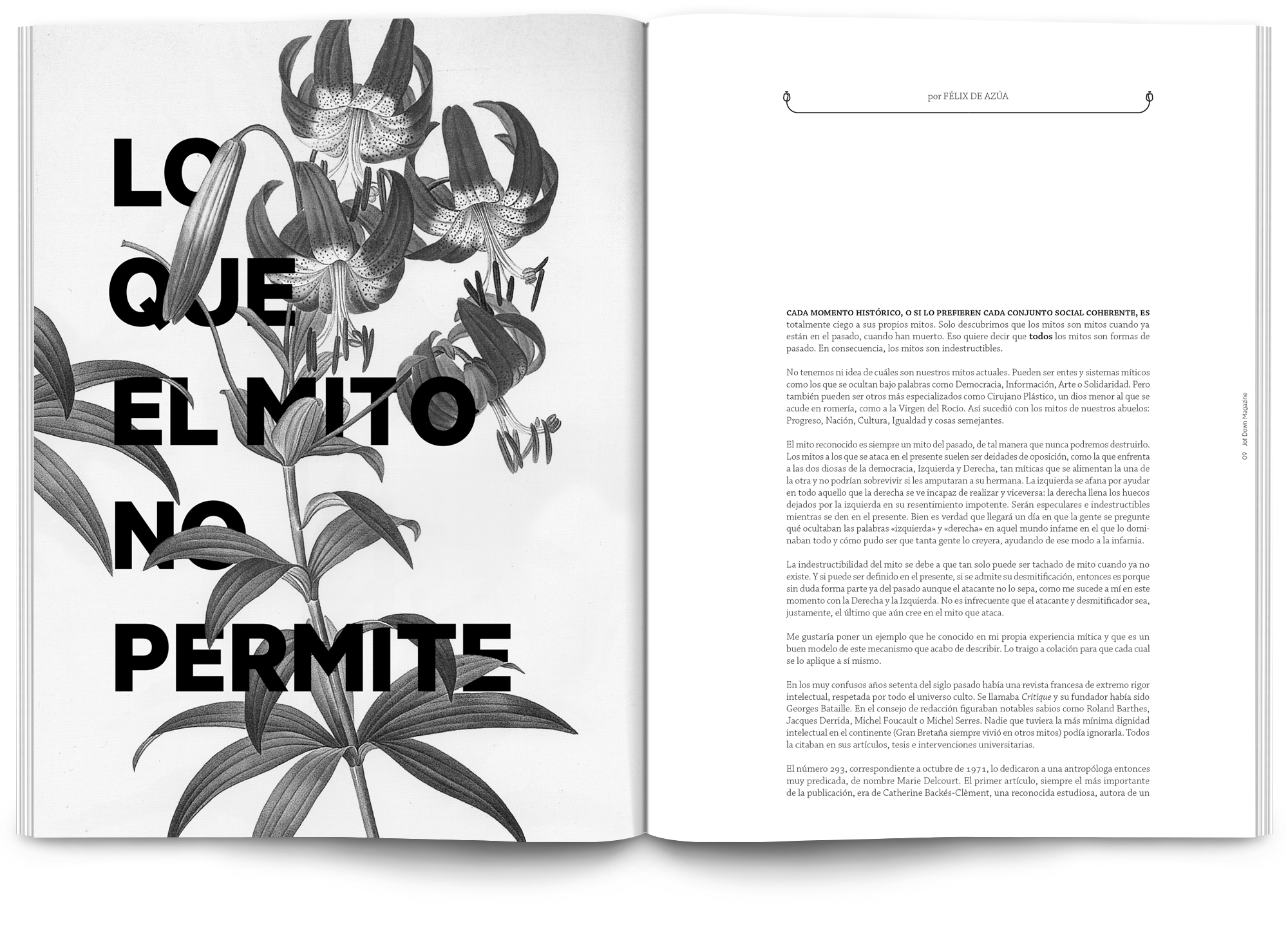Todo el proyecto está desarrollado en blanco y negro, el texto en sí es el elemento principal y el tratamiento tipográfico pasa por la realización de letterings personalizados para los artículos más destacados de cada número.