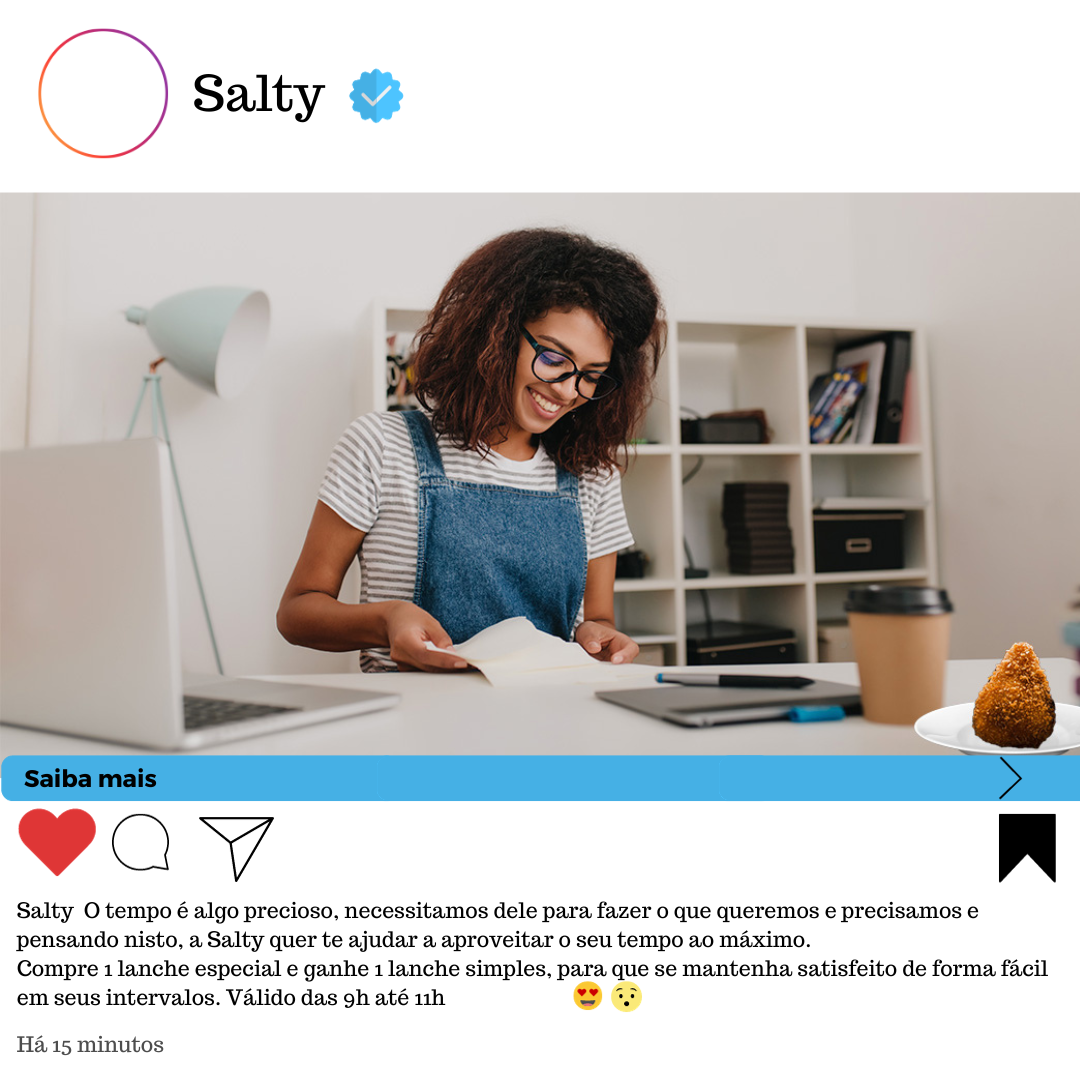 A minha empresa fictícia é a Salty, um negócio que foca no ramo da alimentação e vende salgados fritos e assados para o seu público alvo de 10-25 anos