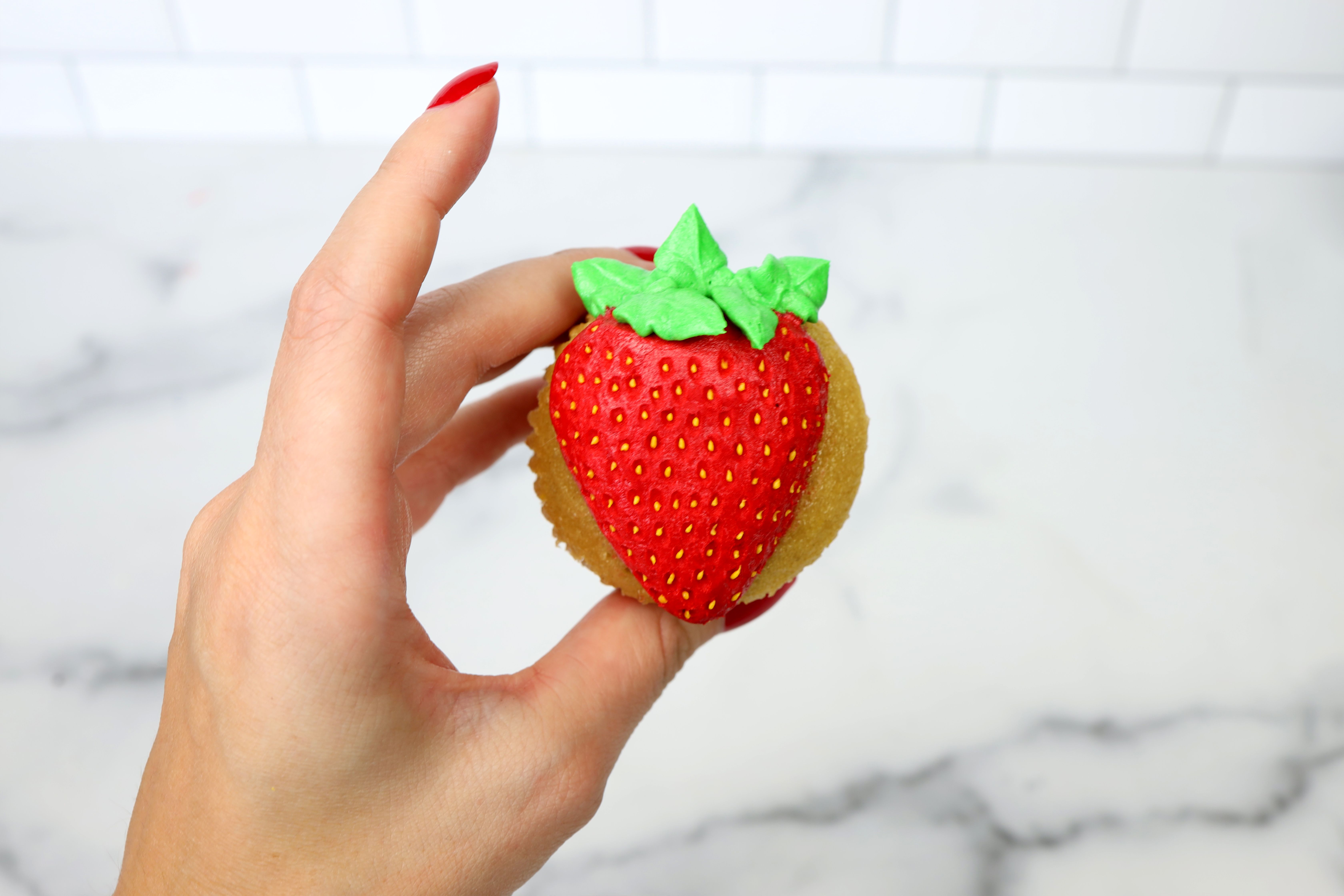 The key to doing that was to create a realistic outer texture of a strawberry. Strawberries are not perfectly smooth on the outside - they have lots of little divots on the outer surface where the seeds go! So to achieve this texture, I first piped, shaped, and smoothed the red base of the strawberry and froze it. Then, once the cupcake was frozen, I used a carving tool to carefully carve out very small divots across the entire strawberry.