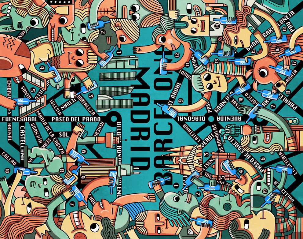 "Blu beer" commercial of San Miguel beer. Map of the places where you can get Blue beer. Mapa de los lugares de Madrid y Barcelona donde puedes tomar la Cerveza Blu de San Miguel.