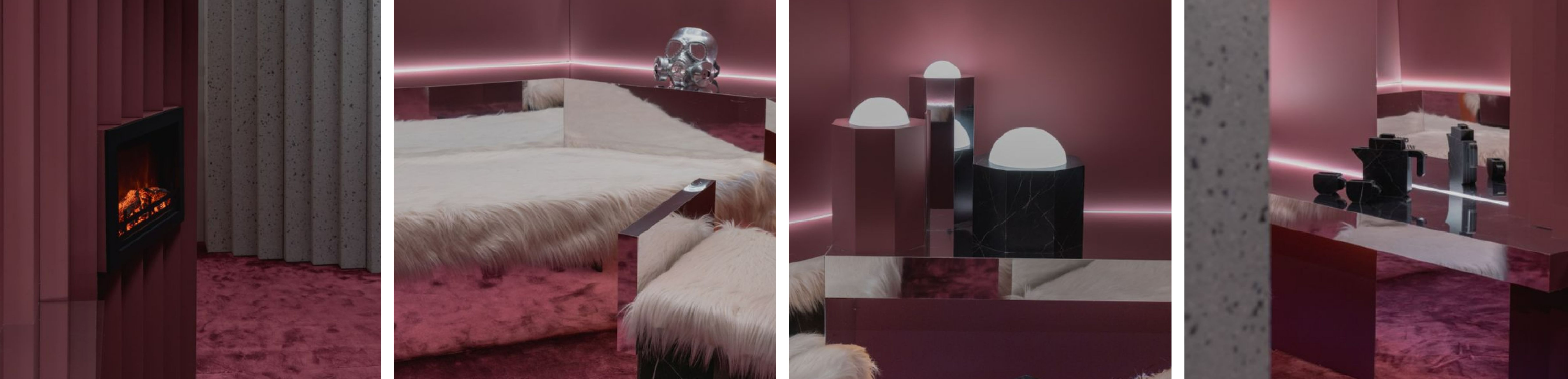 Inside the bunker, visitors discover a minimalist space featuring a living and relaxing area, dominated by a large sofa with a floating bunk bed. Next to them is the desk. The entire space is made with Homapal's Alu Mirror Polished Superior Natural. The suite is completed with a built-in fireplace from Leroy Merlin and a bathtub made with Nero Grafite laminates from Formica Patterns, with Bathco faucets. To exit the bunker, there is a ladder that forces you to look up and reconnect with the outside world. The sensorial and immersive experience is completed with a piece of music composed ad-hoc for the project by musicologist Rigo Pex, playing through Bang & Olufsen speakers, and with the scent of Maison Margiela candles.
