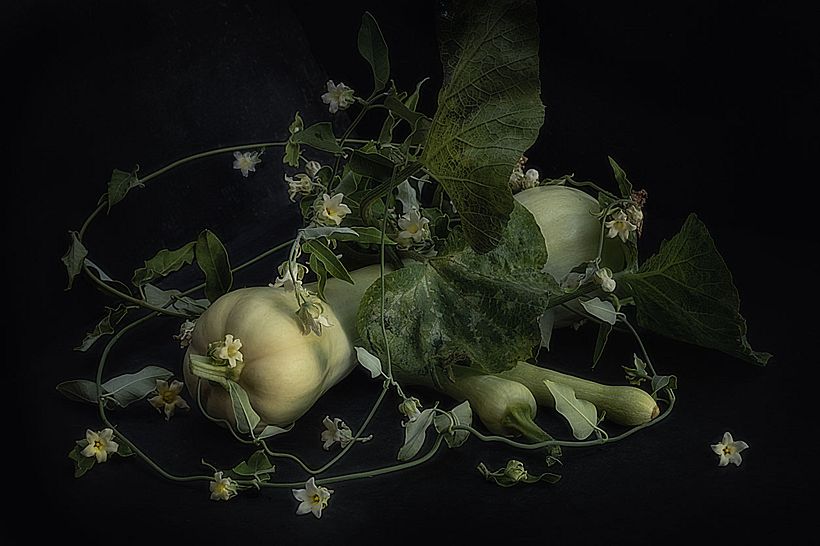 This series results from the inspiration provided by your stimulating course, Daniela, and the produce from my dear neighbor's garden. He gives me some of his varied harvests when I am at home on vacation every summer. That's how I created these still lives, without significant technical resources: only with the natural light of the shady courtyard, a tripod, and my Canon RP camera with 24-105 lens. The retouching was done with Adobe Photoshop. I used an analog and monochromatic color range with some complementary touches.