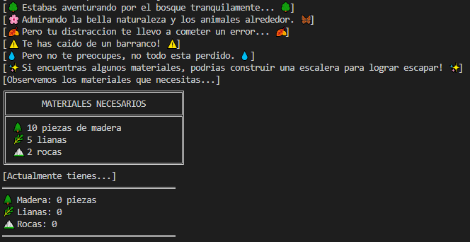 Este proyecto es una demostracion de todo lo que aprendi en el curso de programacion de Python! Es un juego en el que tienes que recolectar herramientas para construir una escalera y escapar del bosque, espero que lo disfruten tanto como yo disfrute crearlo!