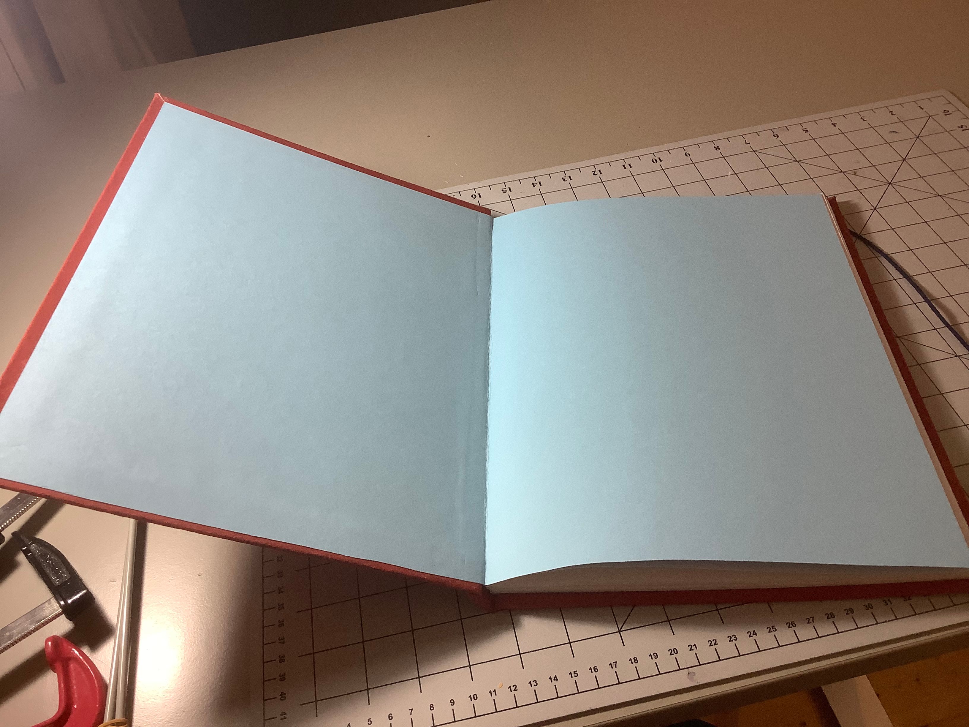 La page de garde est dans du papier bleu que j’avais chez moi. Peut-être que je le décorerais plus tard.
