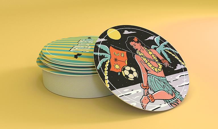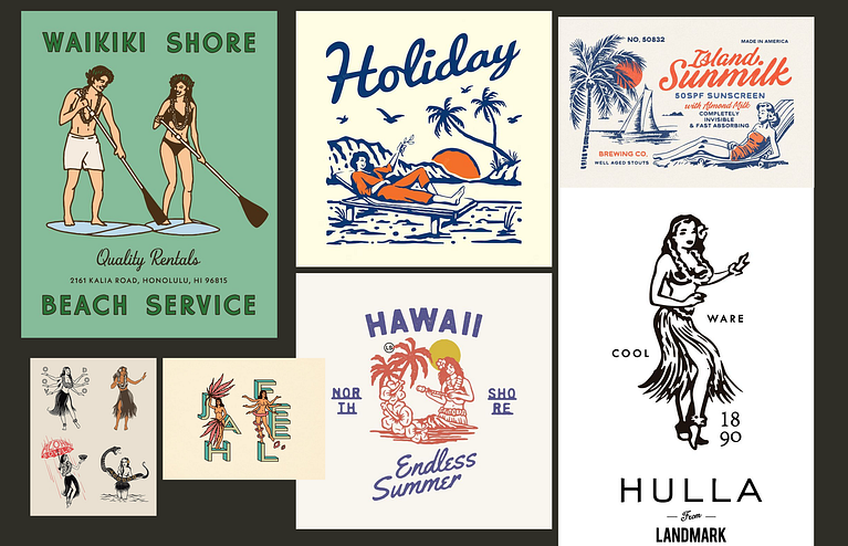 Depois, explorei diversas referências em ilustrações para definir a direção visual do projeto. Foi então que surgiu a ideia de me inspirar em desenhos havaianos, trazendo elementos que evocam refrescância, nostalgia e diversão, criando uma conexão vibrante com o público.