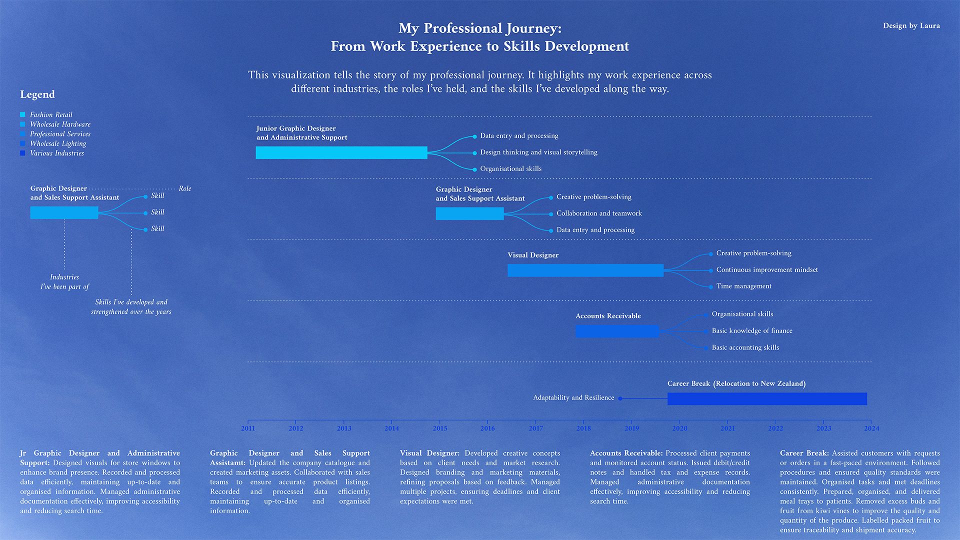 Como diseñadora gráfica en transición hacia el análisis de datos, este curso me dio la oportunidad de explorar cómo ambas disciplinas pueden complementarse. Para mi proyecto final, decidí crear una visualización que reflejara mi experiencia laboral y las habilidades que he desarrollado a lo largo de mi carrera. Es una forma rápida, creativa y efectiva de mostrar mi trayectoria y lo que puedo aportar a futuros equipos.