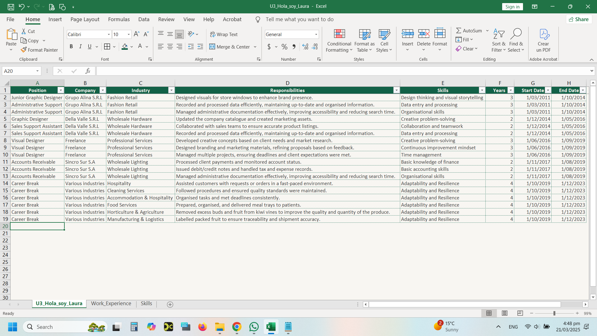En mi caso, decidí crear mi propio dataset en Excel, ya que quería que el proyecto reflejara de manera única mi experiencia laboral. Esta personalización me permitió diseñar una visualización que no solo fuera informativa, sino también auténtica y representativa de mi trayectoria profesional.