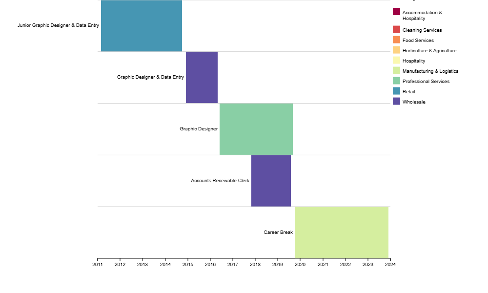 El proceso comenzó con la elección del tipo de gráfico que mejor representaría mi experiencia laboral. Analicé varias opciones, como diagramas de flujo, líneas de tiempo o mapas conceptuales, y finalmente me decidí por un Gantt chart para sentar las bases de la visualización. Este gráfico me permitió representar de manera clara y atractiva mi trayectoria profesional, mostrando las diferentes industrias en las que he trabajado y la duración de cada experiencia.