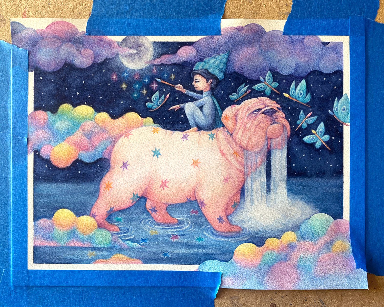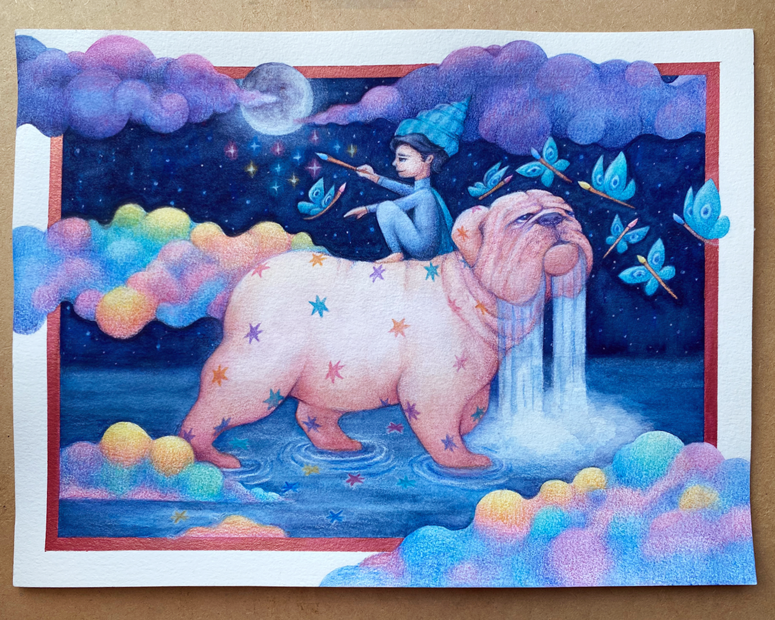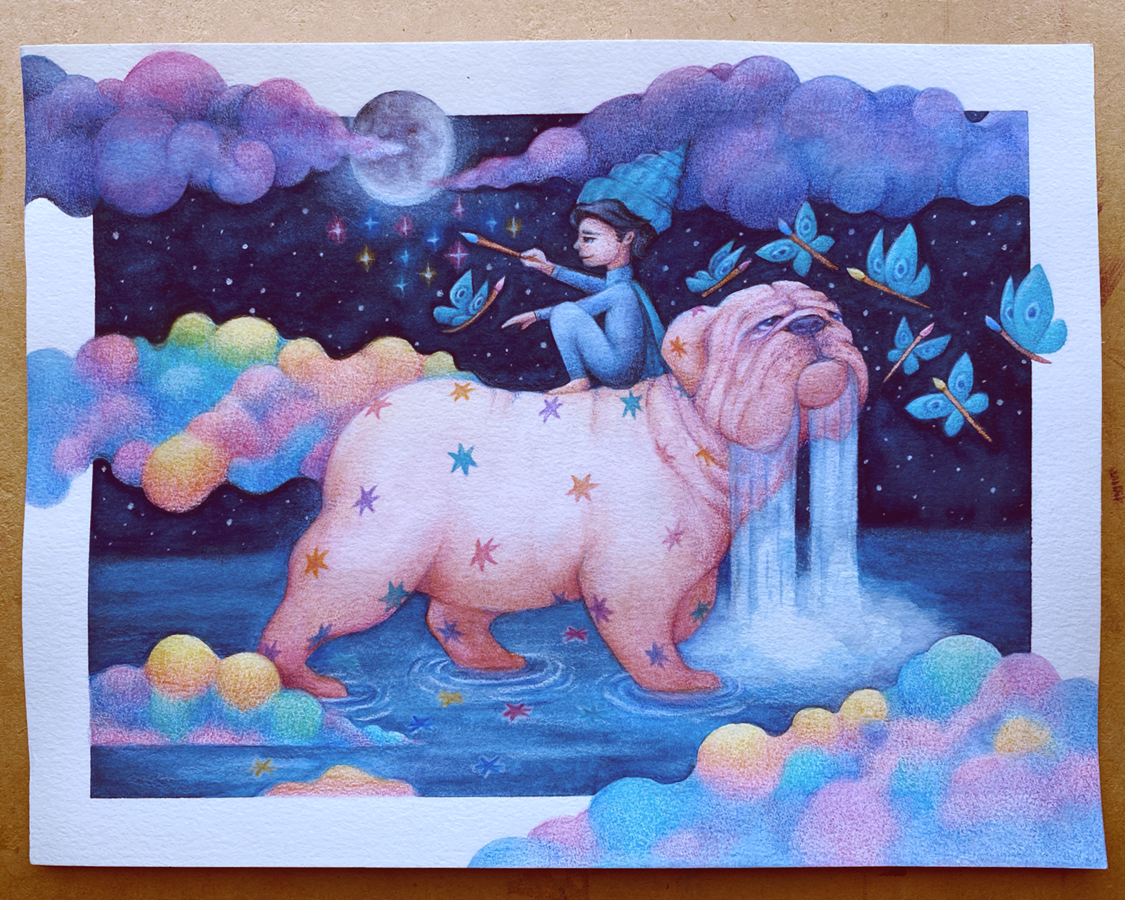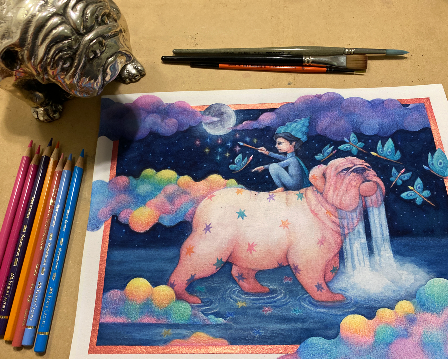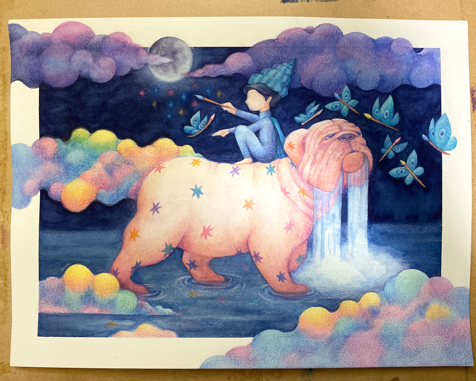 En este punto trabajé más la cara del bulldog, agregué las estrellas de su pelaje, y seguí dando capas de color a las nubes así como a las mariposas-pinceles.