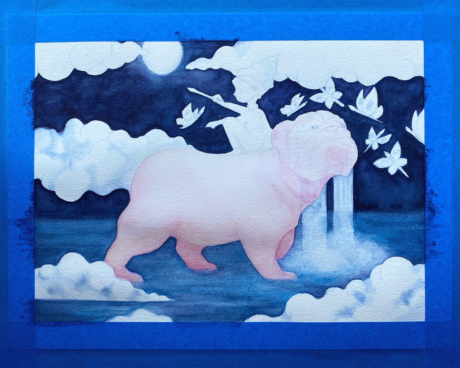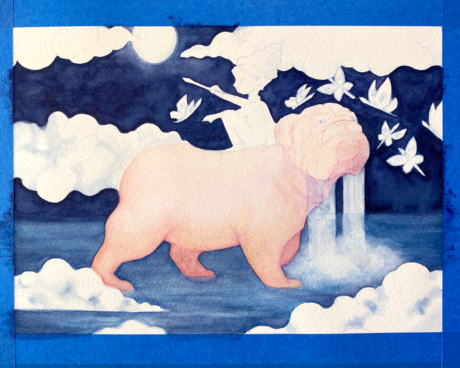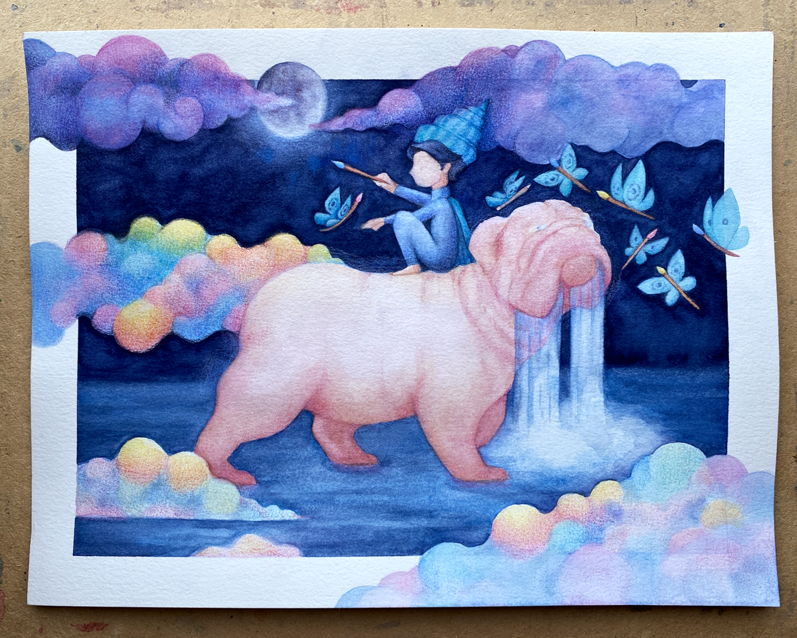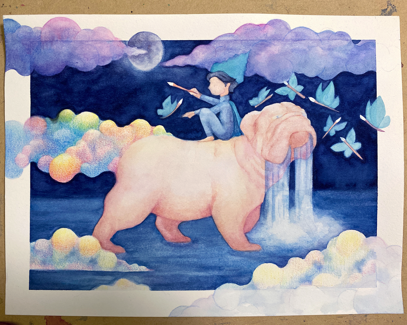En este punto trabajé más la cara del bulldog, agregué las estrellas de su pelaje, y seguí dando capas de color a las nubes así como a las mariposas-pinceles.