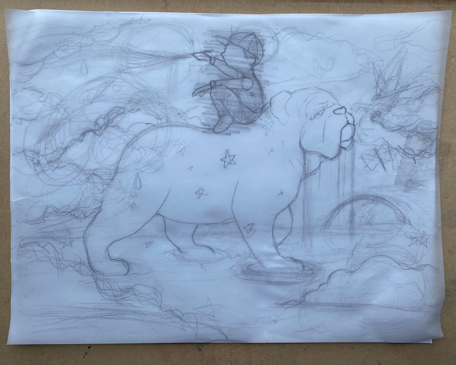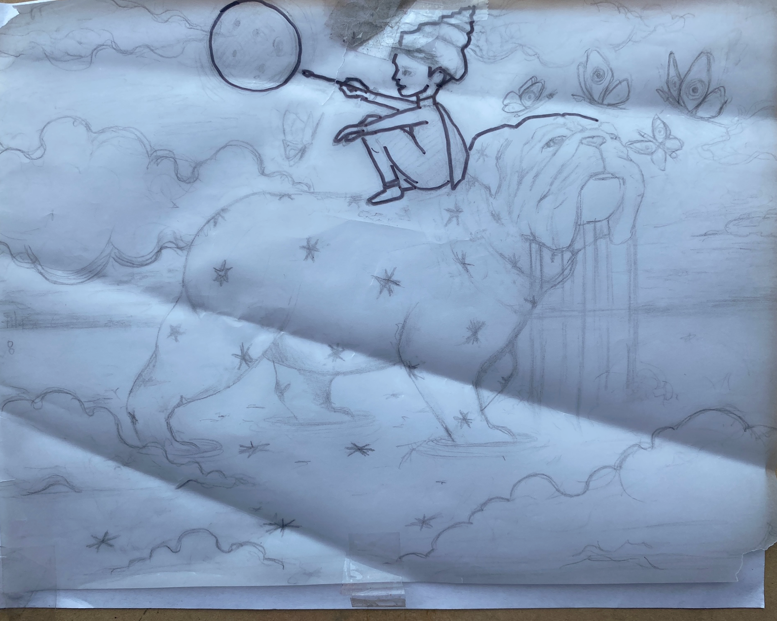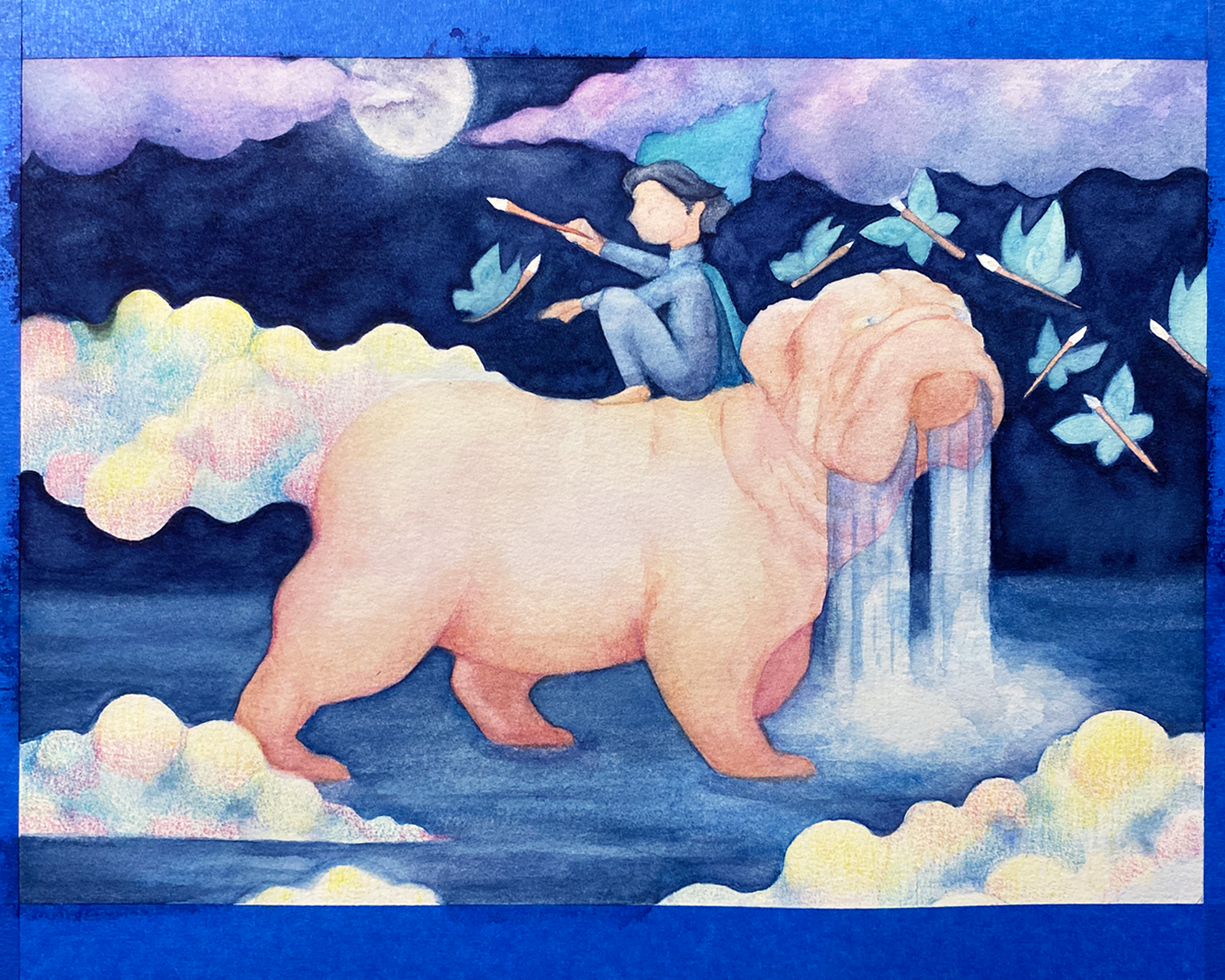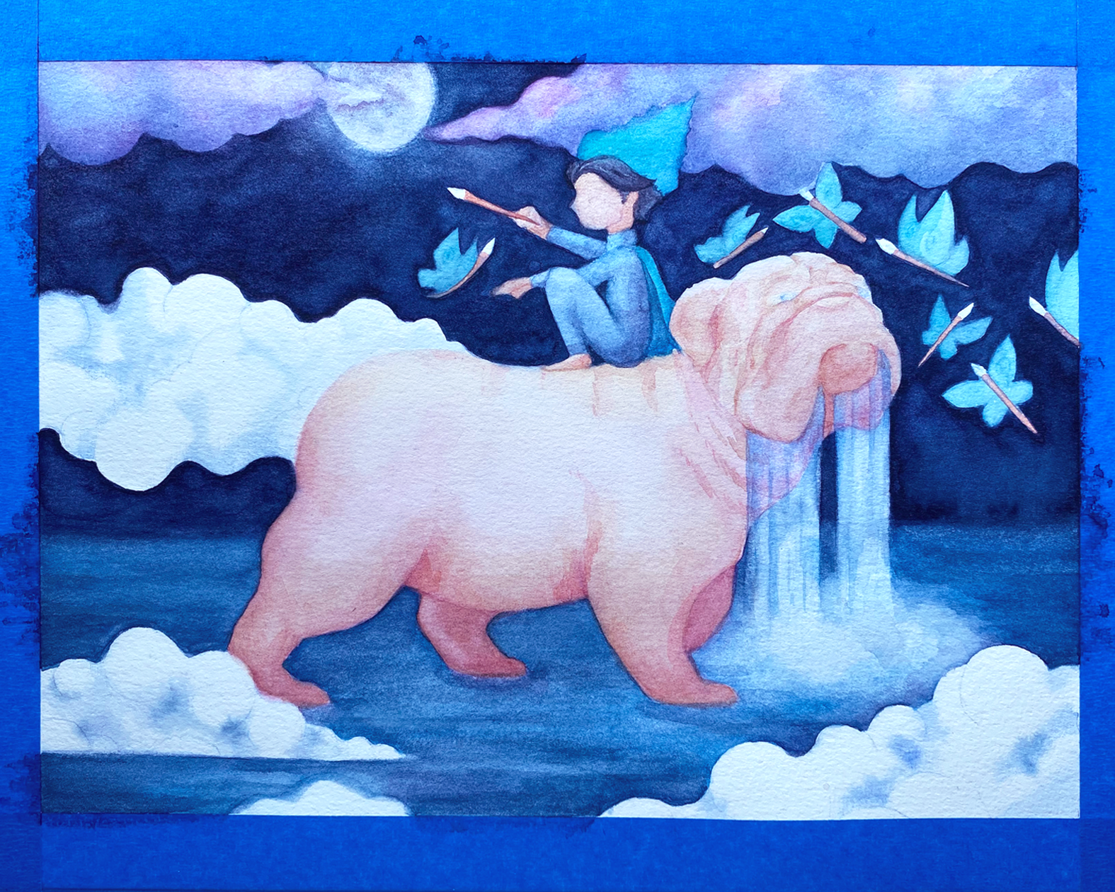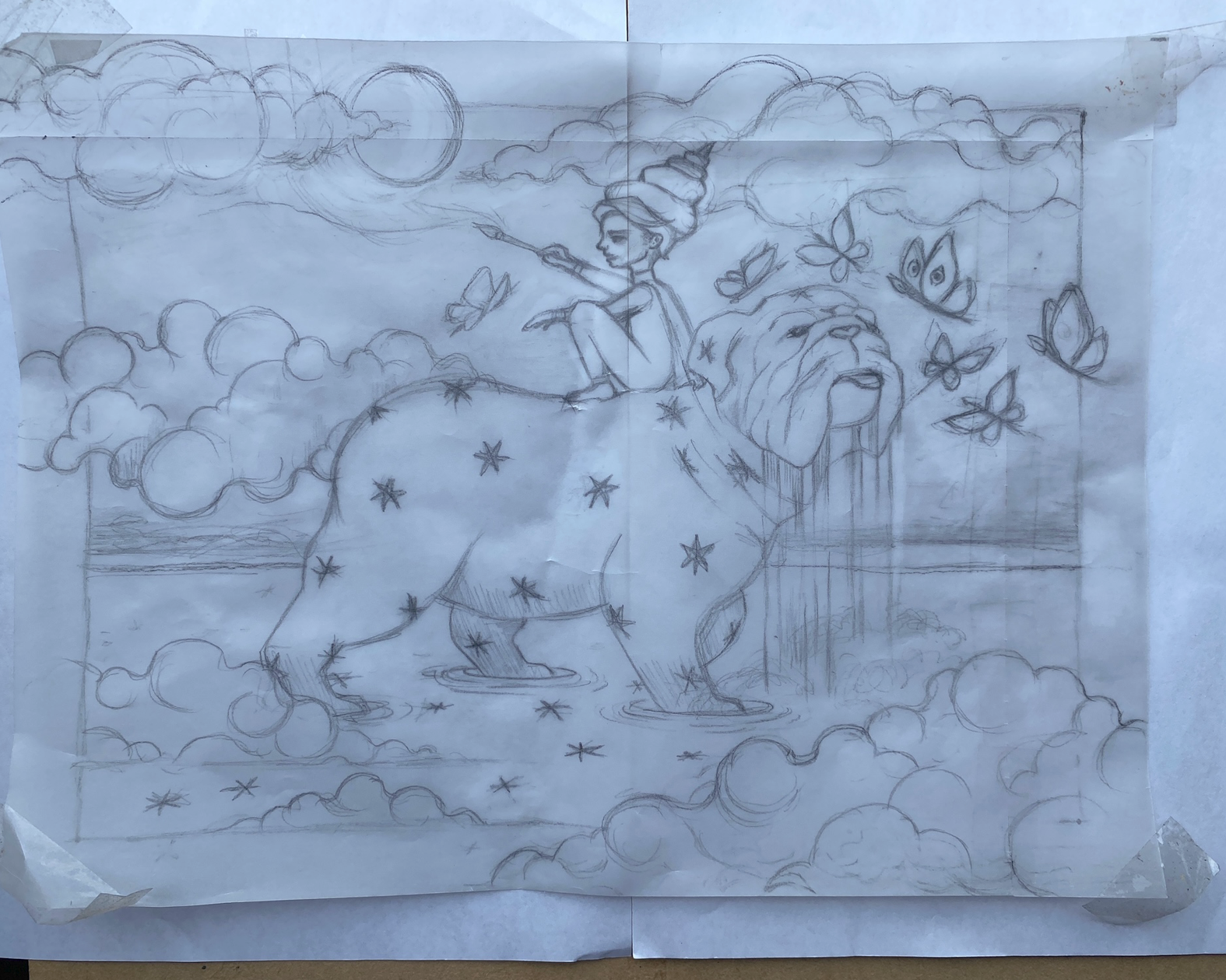 En este punto trabajé más la cara del bulldog, agregué las estrellas de su pelaje, y seguí dando capas de color a las nubes así como a las mariposas-pinceles.