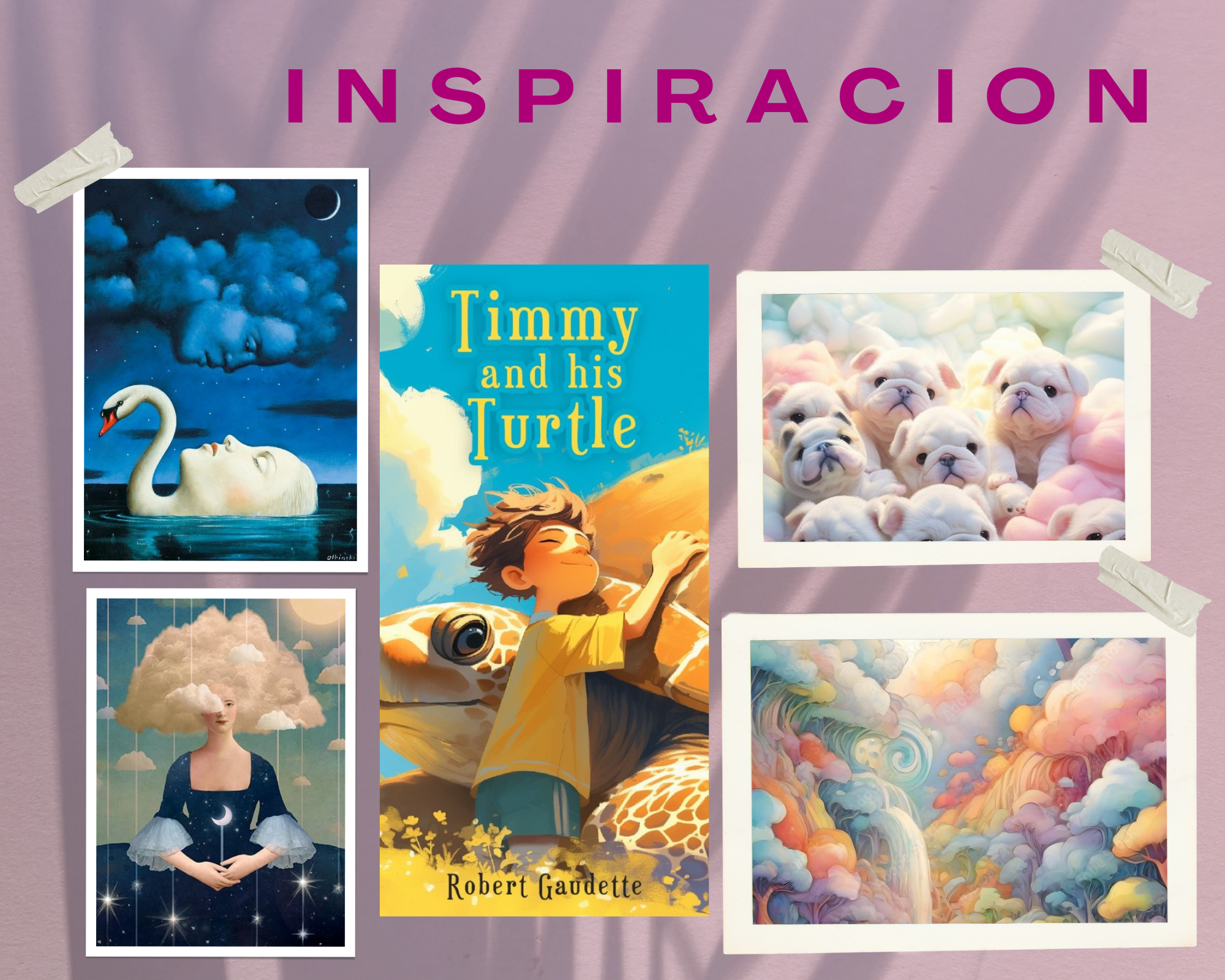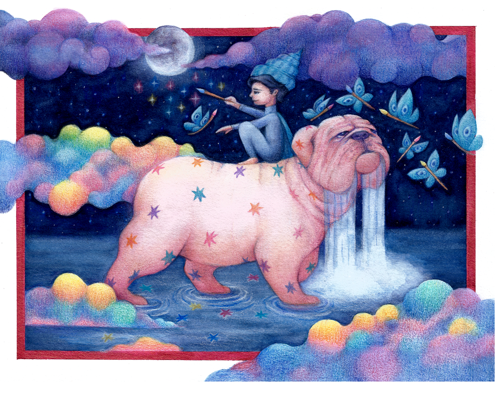 I emphasized the clouds, the bulldog, the butterflies, and the colorful sparkles that come out of the child's brush. It takes a lot of patience to detail and unite all the elements of the illustration.