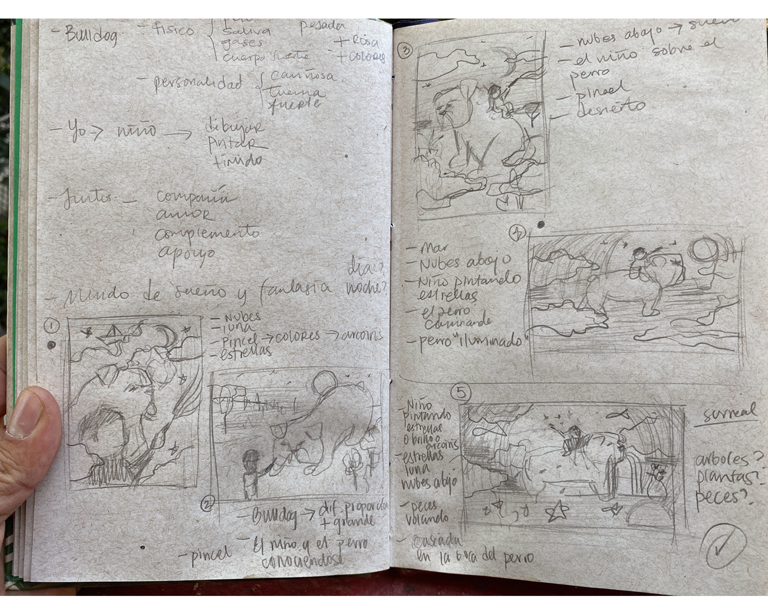 Para mi ilustración pensé en unir a ese niño que alguna vez fui y a Olga, ambos ya no existen, pero pensé en qué pasaría si se unieran en una ilustración de fantasía, casi como un sueño lleno de color y con las cosas que nos gustaban a ambos. Así que la idea para esta ilustración fue responder a la pregunta ¿Qué pasaría si ese niño al que le gustaba tanto dibujar conviviera con su perra que tanto amo en un mundo lleno de color y fantasía?
