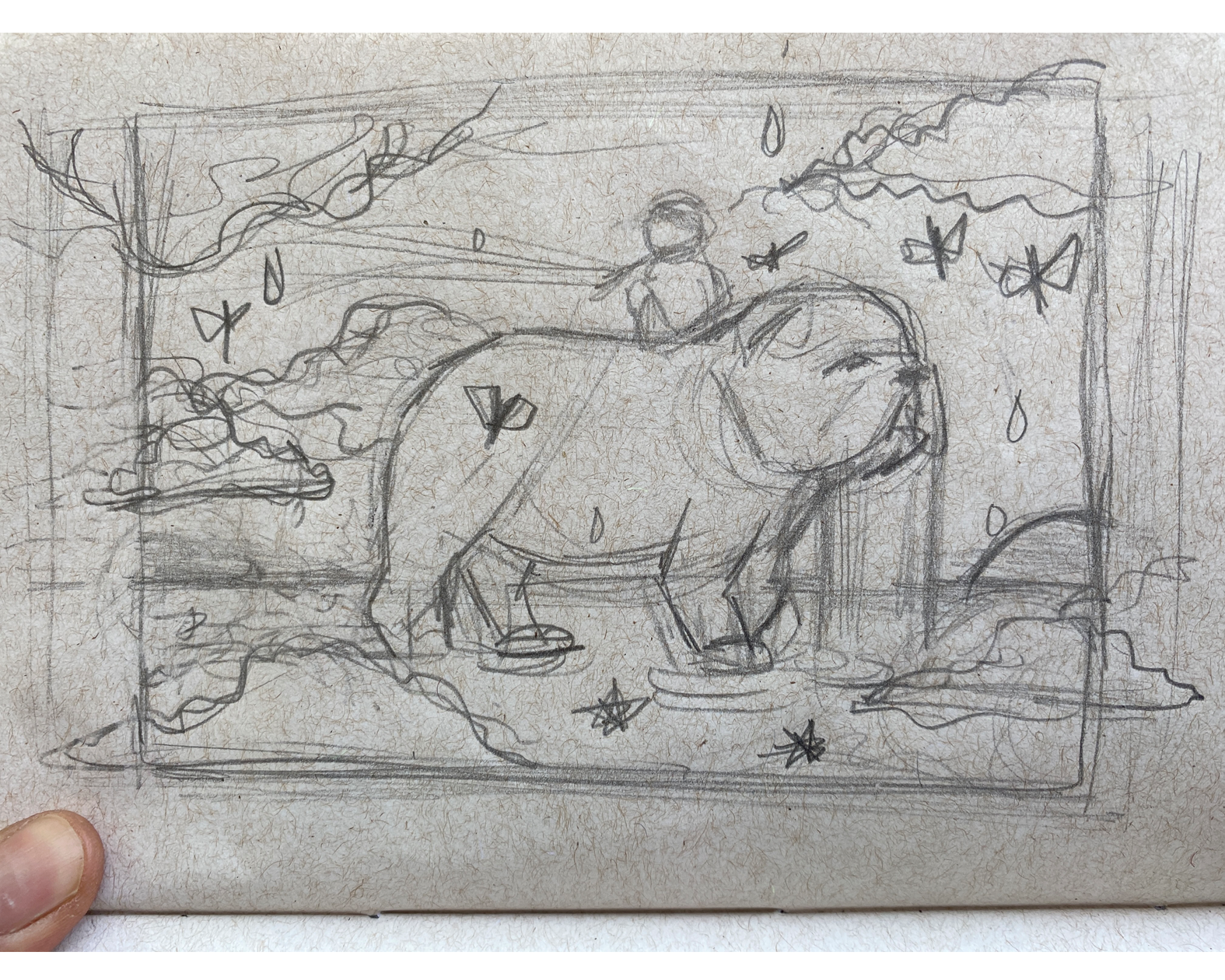 I also worked with white pencil on some effects on the waterfalls and water to simulate the movement of the water around the dog's paws.