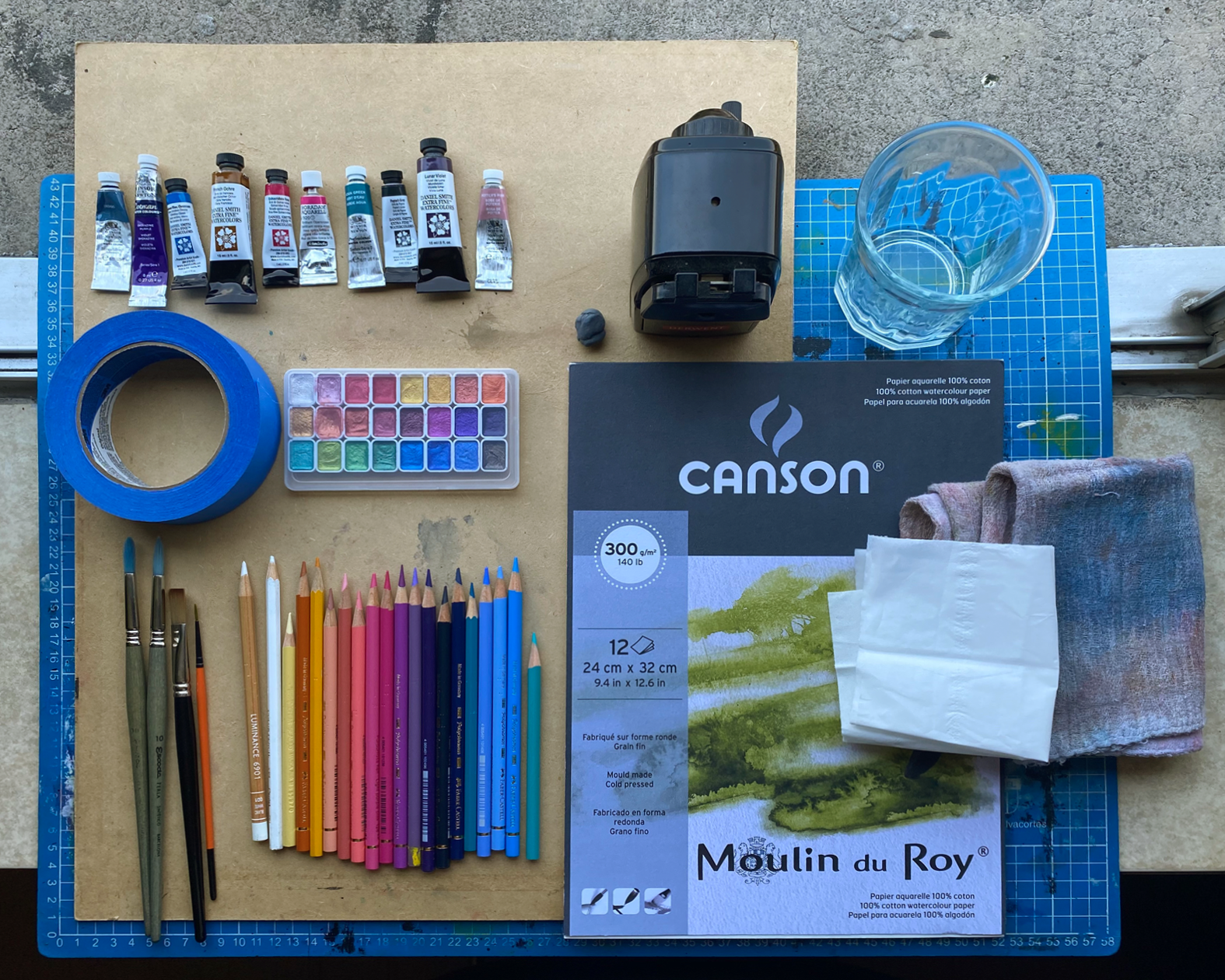 - Canson Moulin du Roy watercolor paper, 300 gsm, 100% cotton, cold pressed, 24 cm x 32 cm