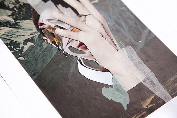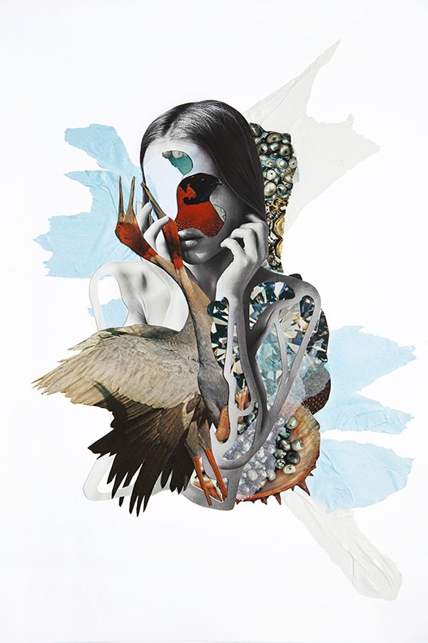 Es genial cuando encuentras a una persona que te resulta inspiradora, eso me ha ocurrido a mí con Clara del Val. Tras mi serie Hypnopompic, tenía muchos retratos preciosos con ella que sabía que en algún momento tendría que utilizar. En esta ocasión, ha sido para realizar una breve serie con algunos elementos de siempre y otros nuevos (las texturas con papeles transparentes de colores). No sé por qué, pero últimamente y con bastante frecuencia, tengo sueños en los que aparecen aves de diversa índole, que mutan y cambian de color y se cuelan entre las cavidades corporales de una figura imaginaria, que me observa callada, para después imitar los sonidos guturales de las visitantes que revolotean a nuestro alrededor.