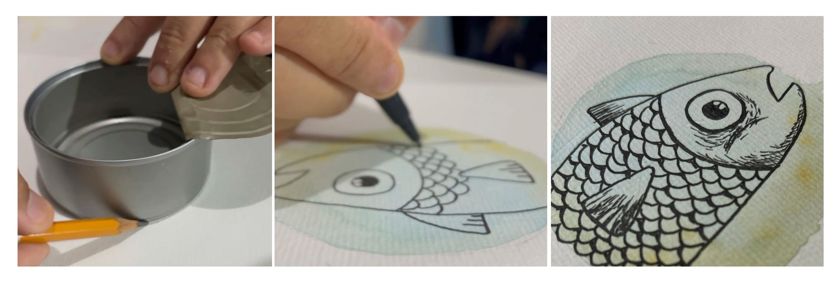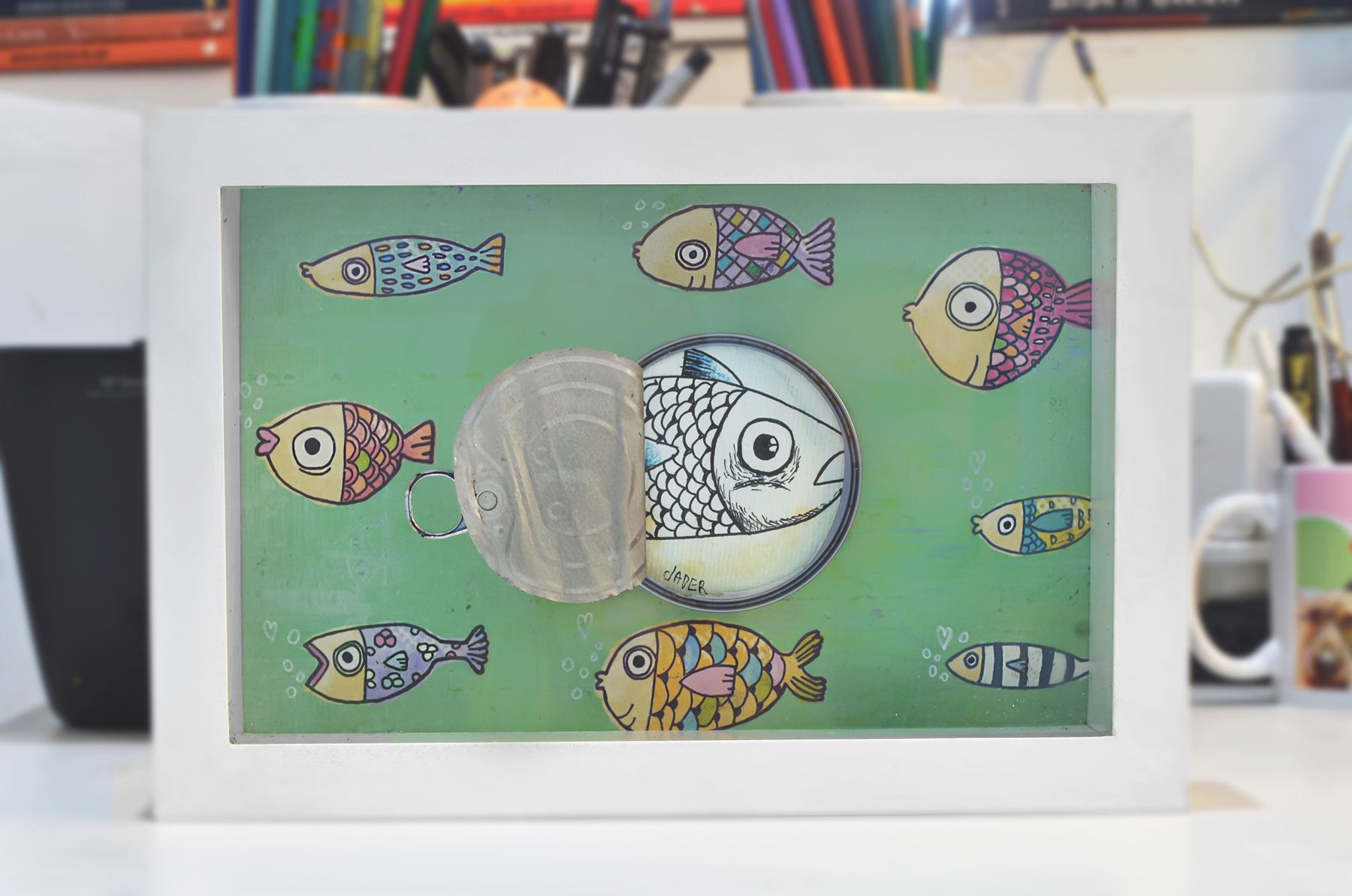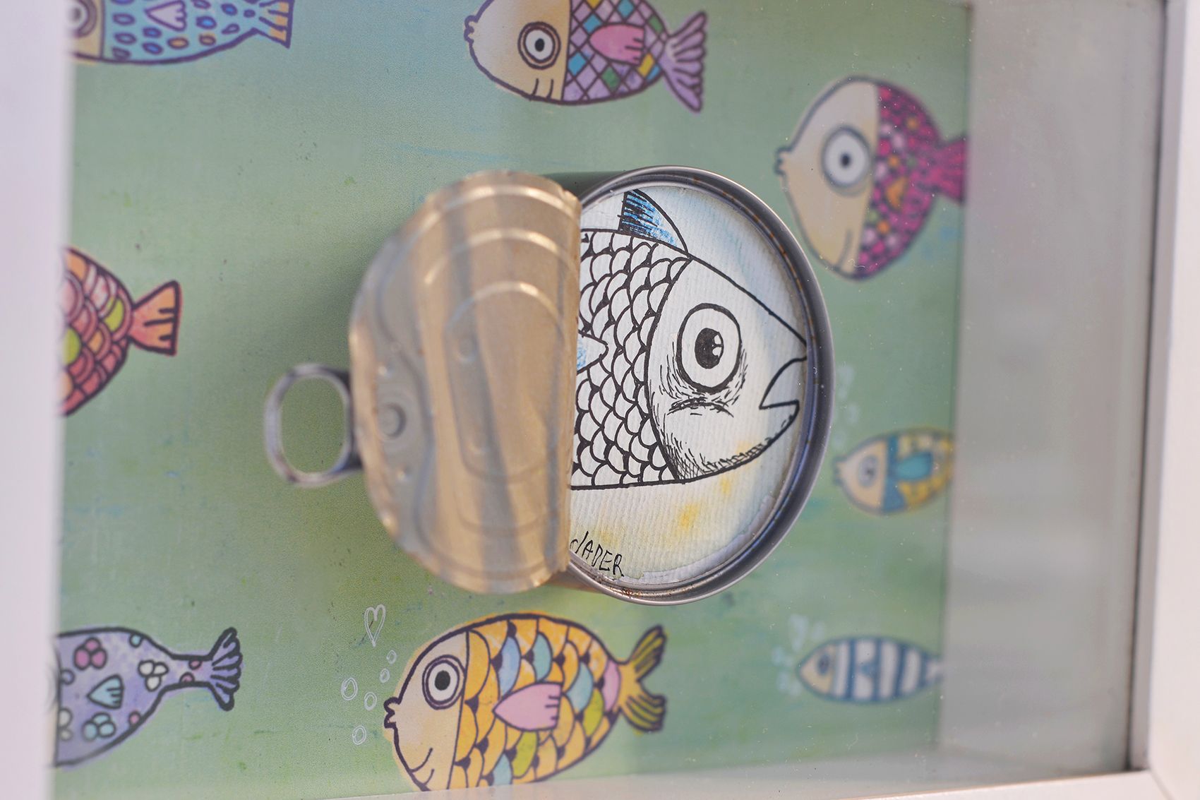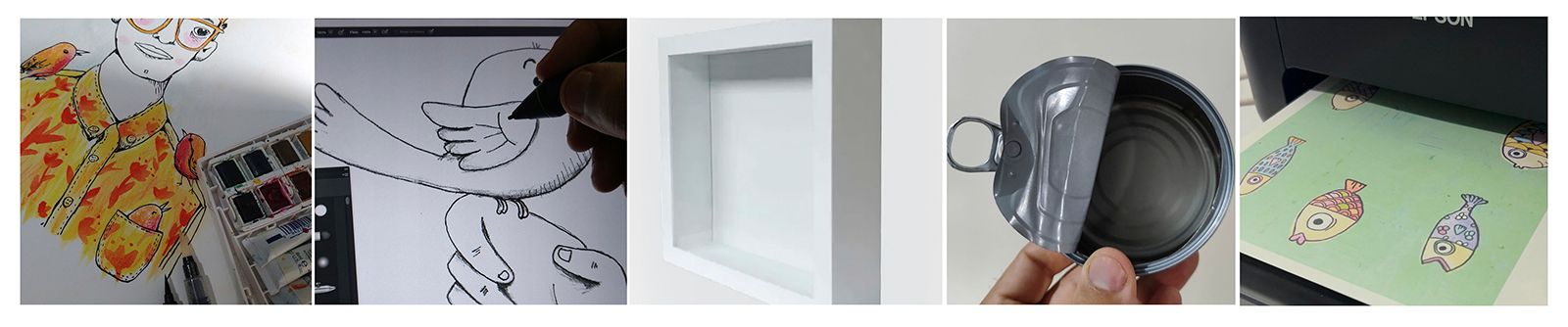 I am a designer and illustrator and in my work as an illustrator, I have worked with illustrations on different media. Among them: kitchen boards, aquariums, sardine and tuna cans and even cream crackers! And canned goods are the ones that have awakened a certain passion in me. In this technique, I create illustrations with traditional materials such as watercolor, Indian ink, colored pencils, among others, and I adapt these illustrations to the format of the can, using it as a support, turning the illustration work into a decorative art.