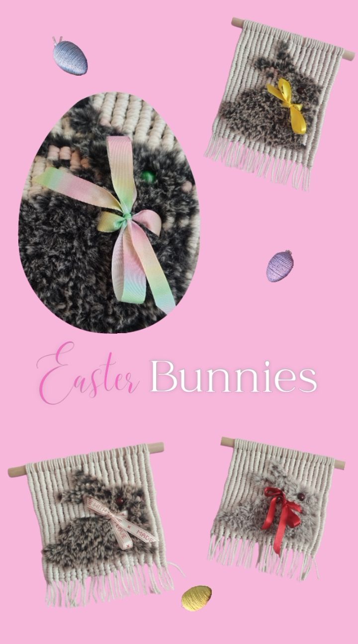 These cute Easter bunnies were my first designs in the vertical macramé style. The fluffy yarn stands out against the 3mm macramé cord used for the background and is so much fun to work with. The colorful ribbon, perfectly fitting for Easter, gives the little bunnies a touch of elegance and playfulness. I gave many of them as gifts and received enthusiastic reactions.