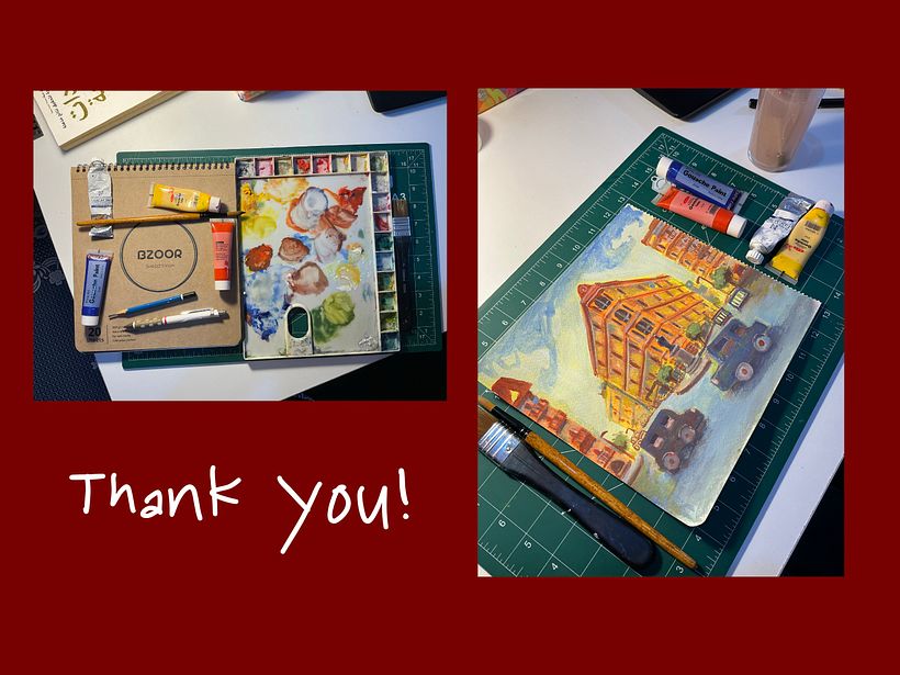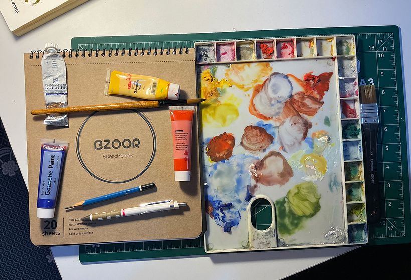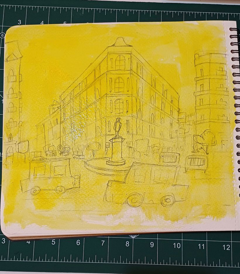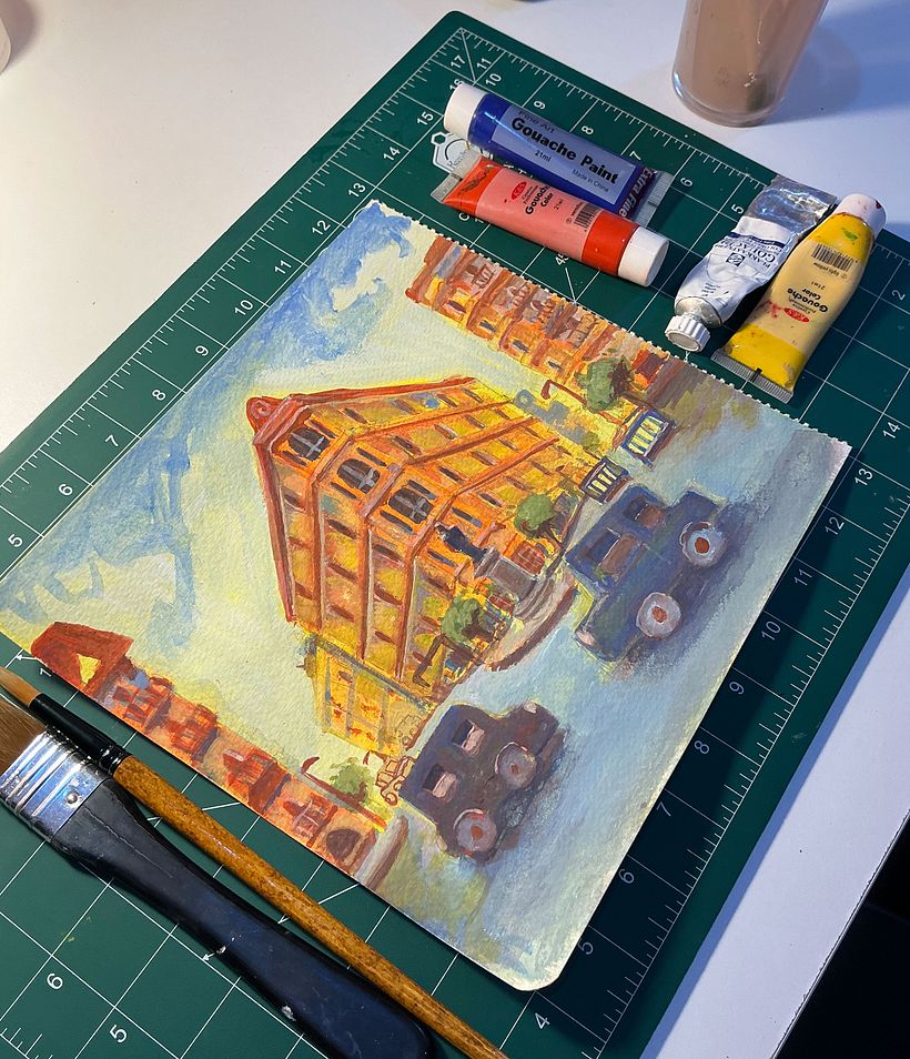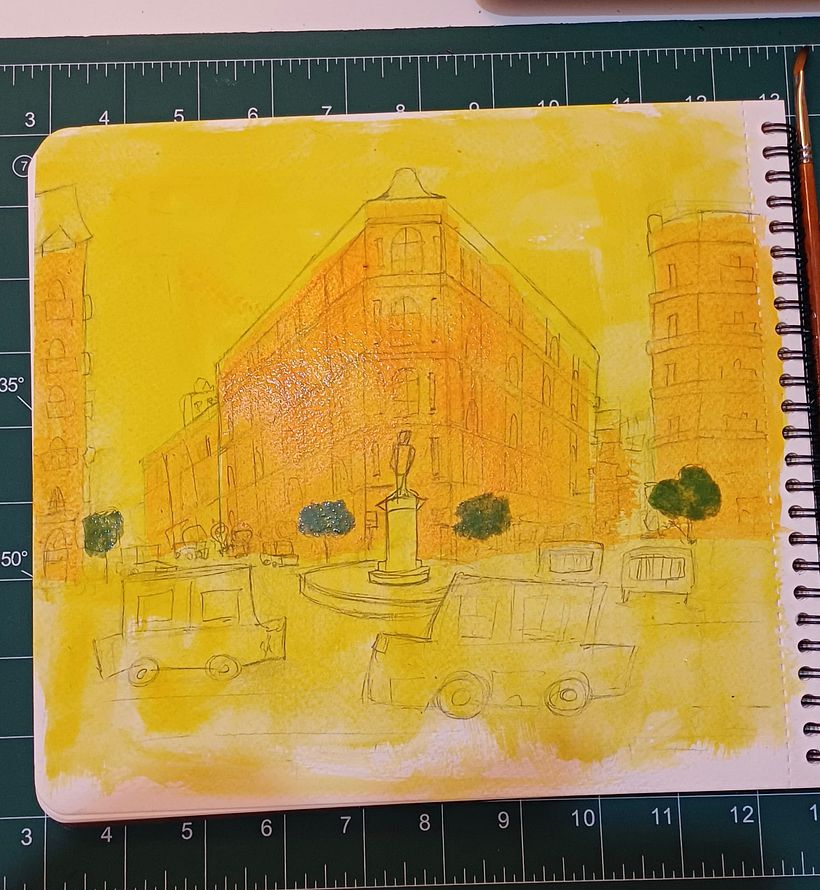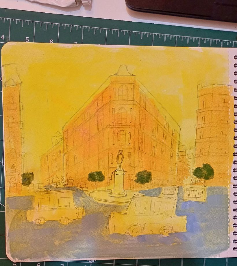 I started the piece using a 10H technical pencil to lightly block in the structure and perspective. Once satisfied with the layout, I refined the lines with a 0.5 mm Rotring mechanical pencil. For the painting process, I chose a 23 × 25 cm Bzoor sketchbook with 320 gsm natural white, cold press paper—ideal for gouache and layering. My palette was intentionally limited: cobalt blue, bright yellow, vermilion, and white, applied with both flat and round brushes. I mixed colors on a white plastic palette and used just a cup of water and paper towels for support. A quick thumbnail was created on a 13-inch iPad Air to plan the composition. The biggest challenge was maintaining clarity in the architectural forms while keeping the brushwork expressive and lively.