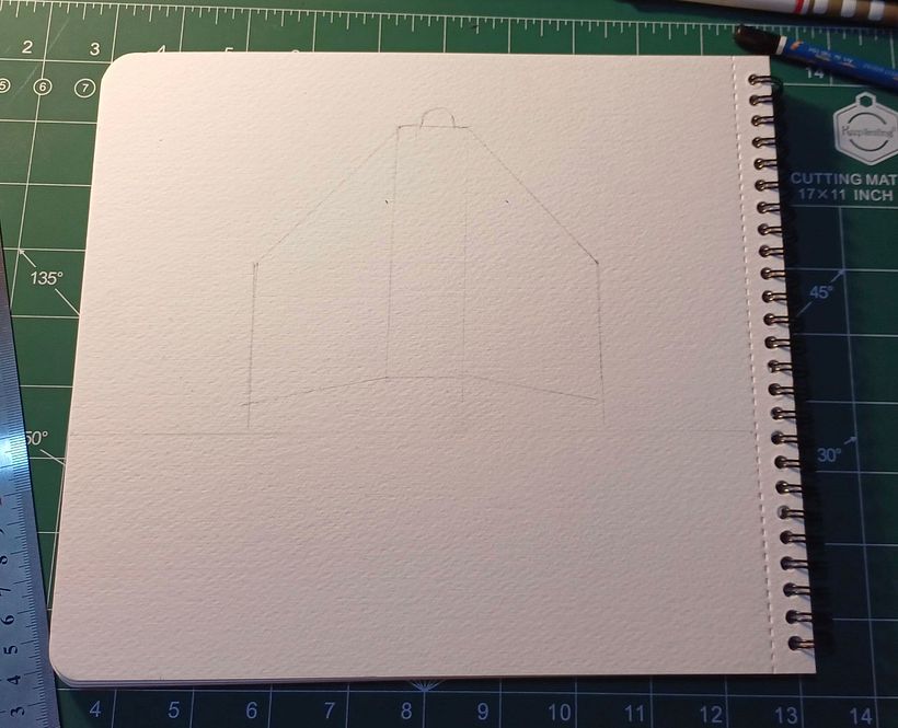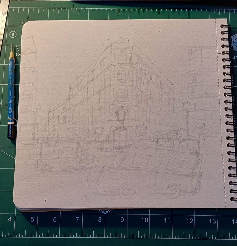 Sketching began after finalizing the perspective. I used a 10H pencil to carefully map out vanishing points and build the framework. With the perspective locked in, I started blocking in the larger shapes—especially the main building and foreground elements.