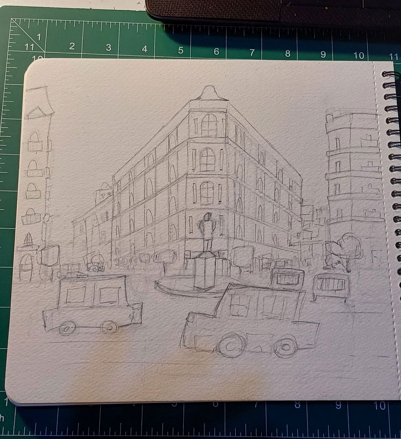Before I touched paper, I started with this quick digital thumbnail using Procreate on my iPad. I wasn’t focused on details yet—just trying to capture the overall composition, perspective, and rhythm of the scene. This rough sketch helped me plan the placement of buildings, cars, and the focal point. It gave me the clarity and direction I needed before moving on to the pencil sketch on paper.